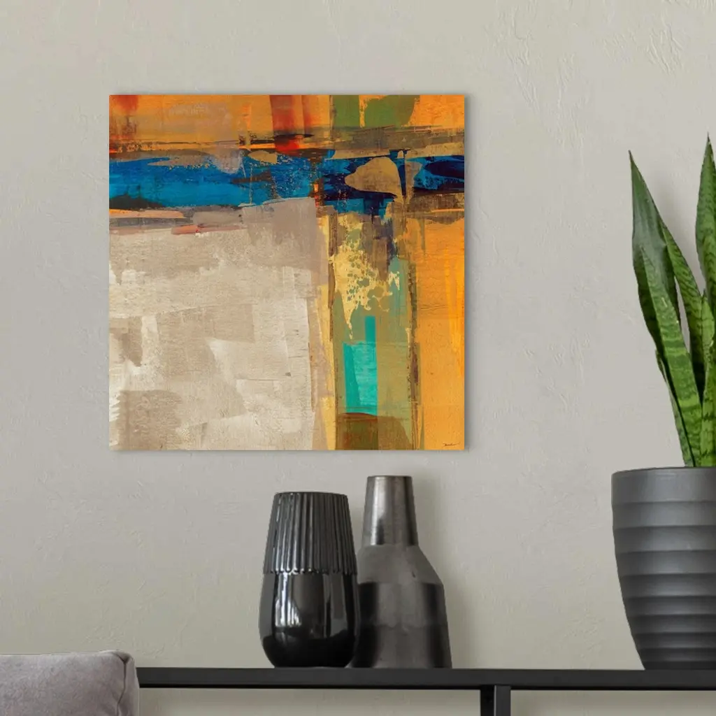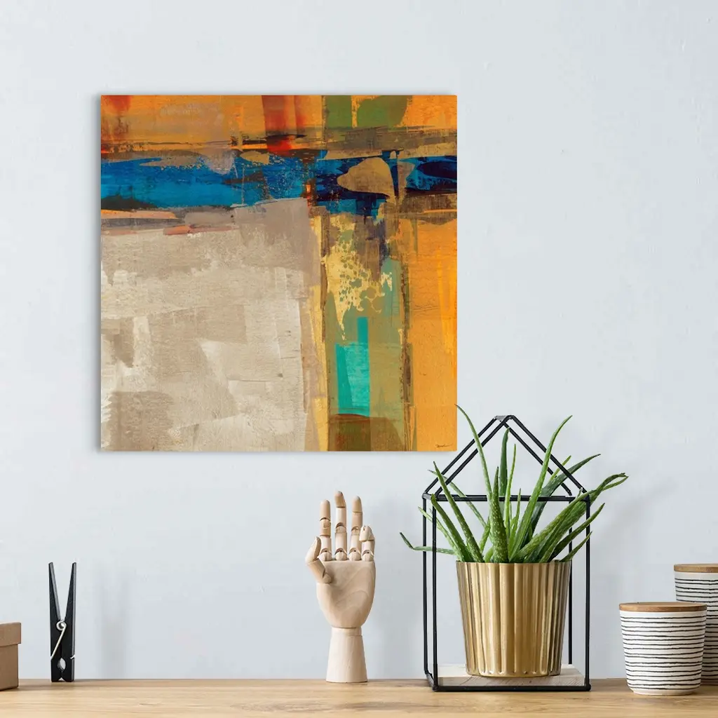 A bright square abstract painting of thick crossing colors of orange, blue, yellow and green.