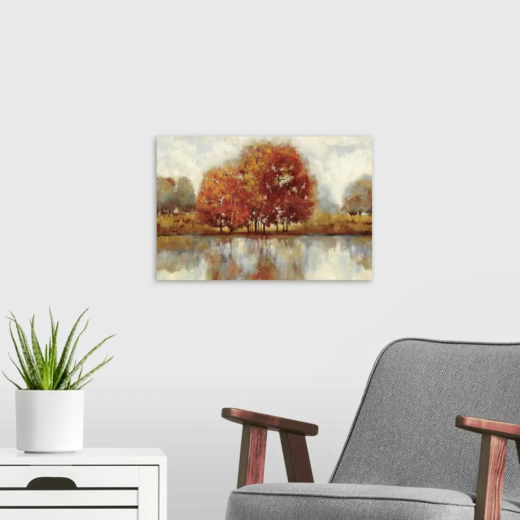 Contemporary painting of a countryside forest scene in autumn foliage.