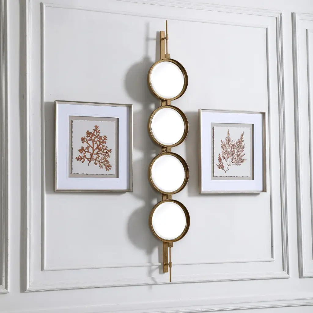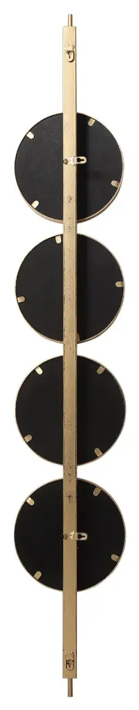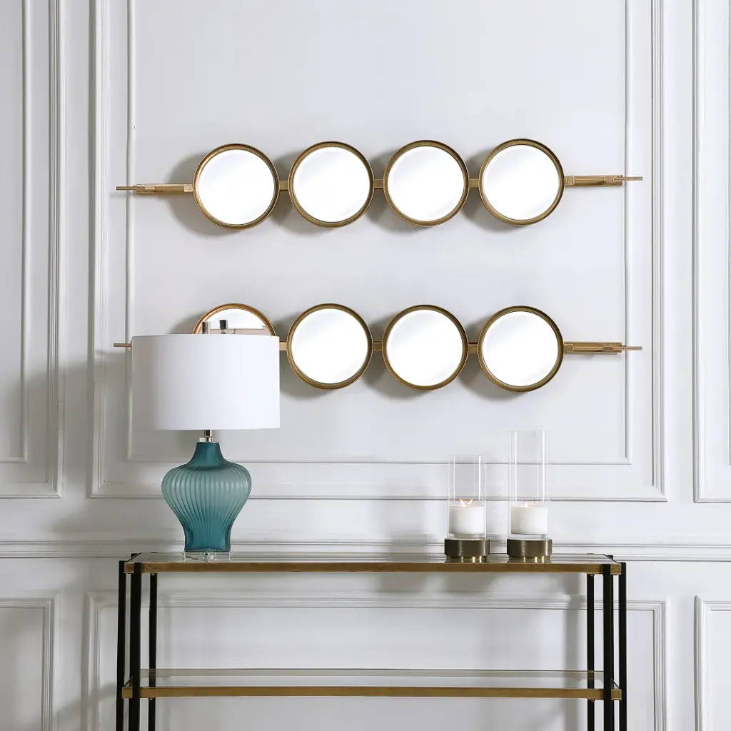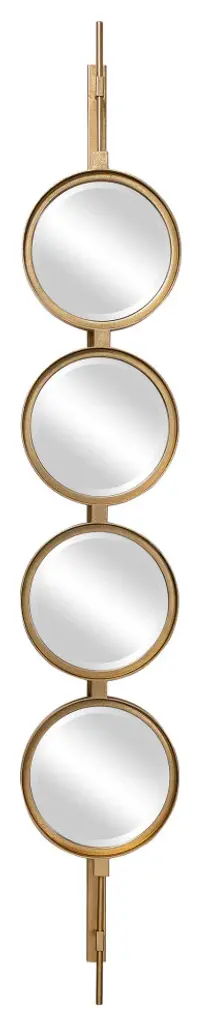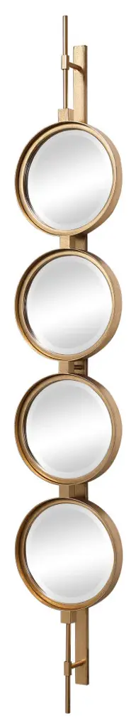 Contemporary In Style, This Mirror Features A Sleek Iron Base With Linear Metal Accents. The Piece Is Finished In Gold Leaf With Four Round Beveled Mirrors. Group Multiple Pieces Together And Hang Horizontal Or Vertical To Create A Truly Unique Wall Feature.• 60"H x 10"W x 3" deep. Each mirror is 9" dia. Weighs 11 lbs.• Hand Finished Iron Frame.• May be hung vertically or horizontally. Properly weighted hanging hardware attached.• Heirloom Quality - Expertly hand crafted and hand finished. Due to the hand crafted nature of this piece, each piece may have subtle differences.