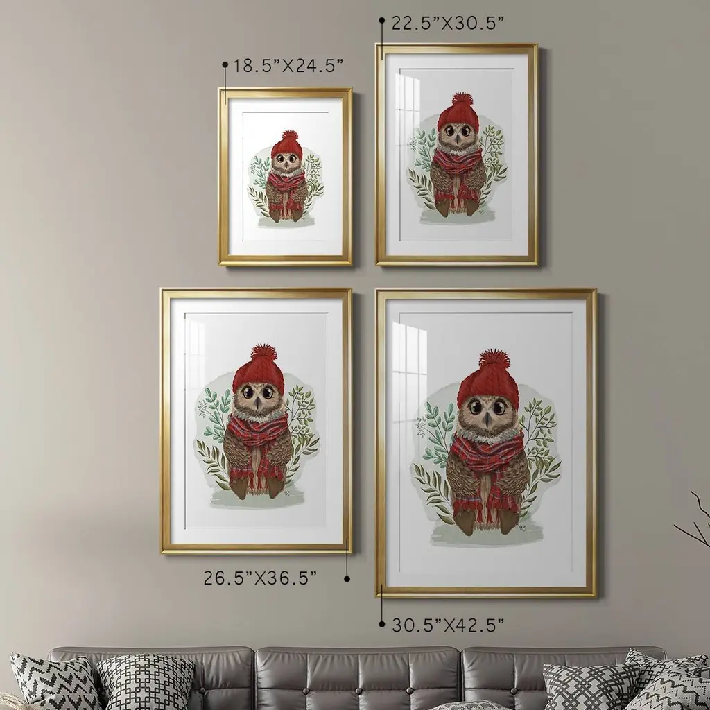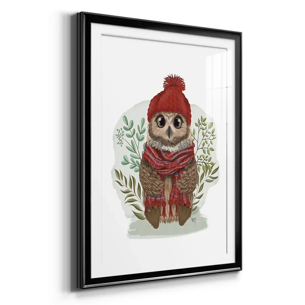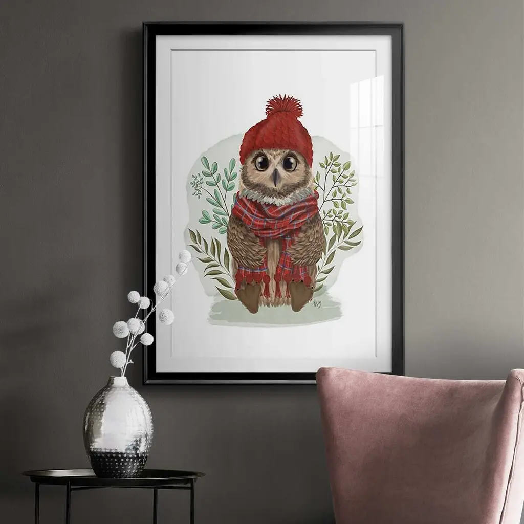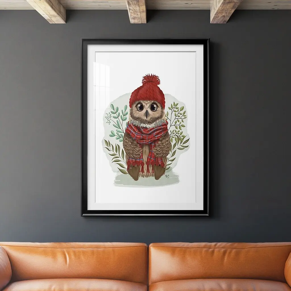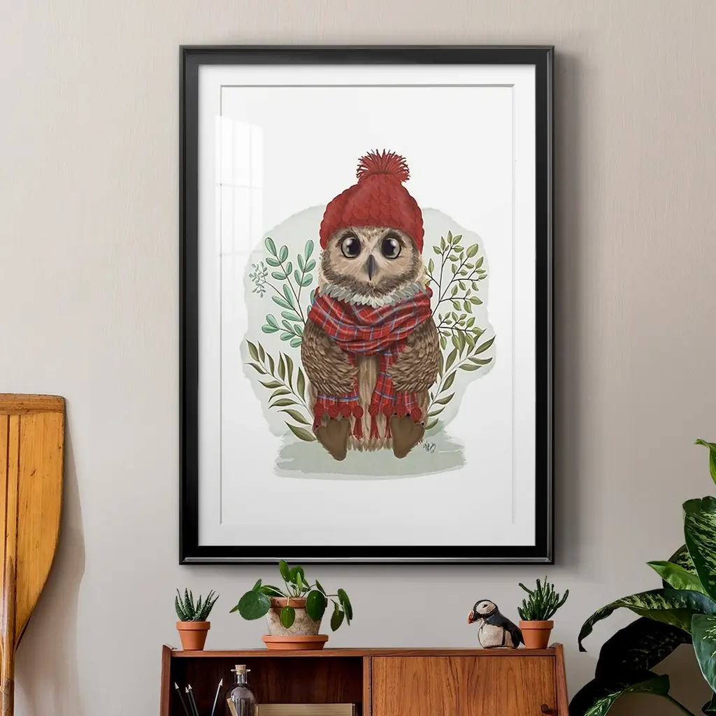 Owl in Tartan Scarf Premium Framed Print - Ready to Hang A Premium Framed Print created to last. Framed in distressed wood and available in an array of sizes and colors Featuring a beveled a solid wood stretcher bar, each piece comes ready to hand 4 SIZES AVAILABLE 30.5''X42.5'' - Overall Size 26.5'X36.5'' - Overall Size 22.5''x30.5'' - Overall Size 18.5''x24.5'' - Overall Size Each piece is made to order. Each piece comes with hanging hardware. Made in the USA Ready to Hang Giclee Paper Print Acrylic Glass Beveled Matt Board