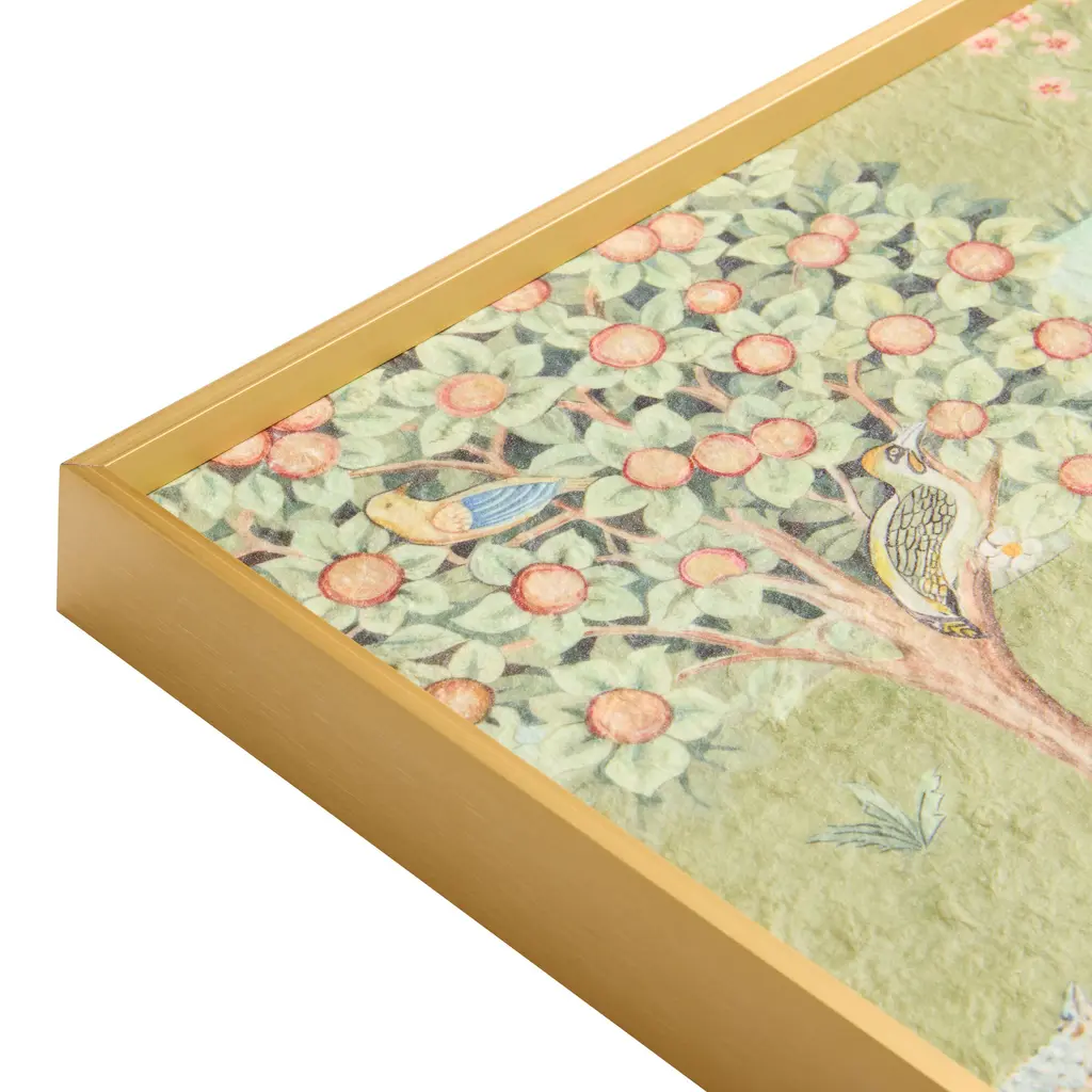 An owl perches in a weeping willow by a river in a landscape dotted with shrubbery, fruit trees, and animal life in our framed wall art diptych. Printed on textured paper in a ready-to-hang, beveled-gold frame, this piece was originally created by 19th-century designer William Morris, who was inspired by fine craftsmanship and natural beauty. Its soft pastel hues and serene subject matter lend a tranquil charm to the home or office.