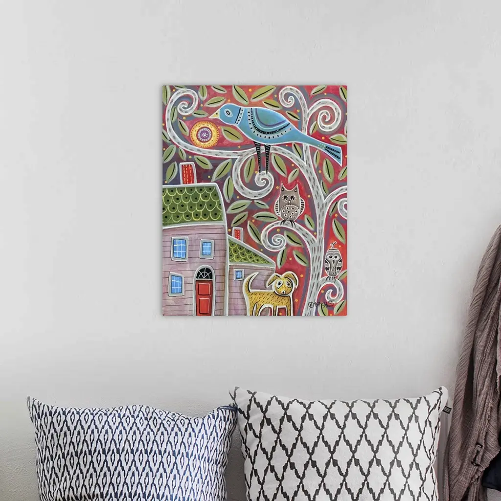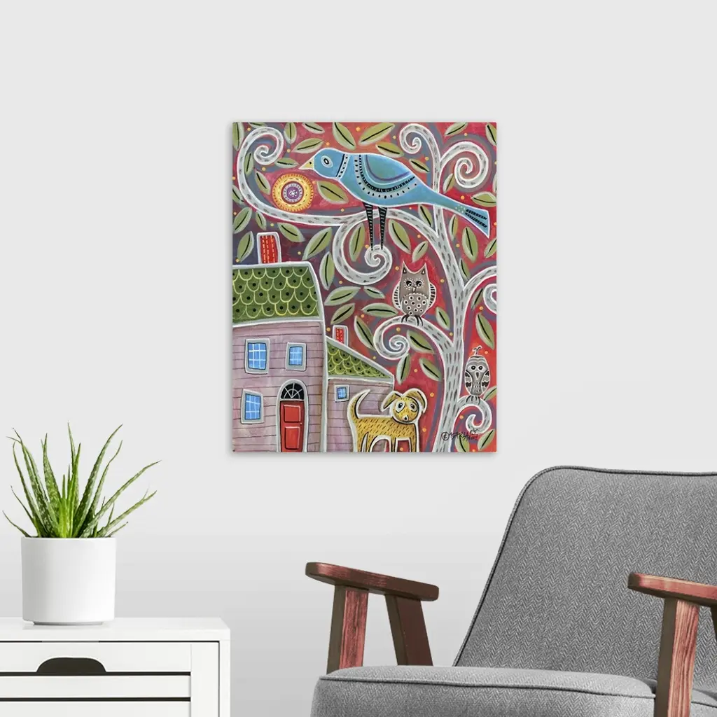 Contemporary painting of a large bluebird and two small owls in a tree above a dog.