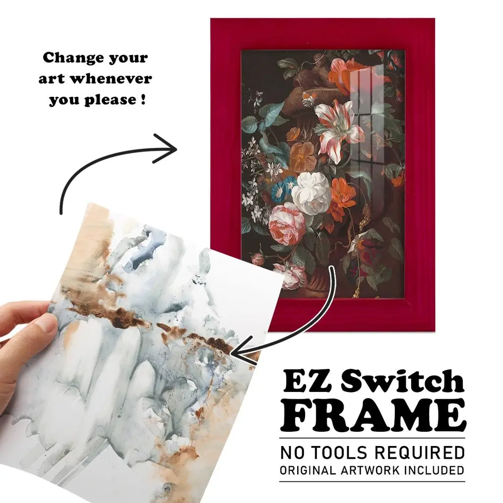 Oxide III -EZ SWITCH Framed Print w/glass-Cherry Red A delightful, framed print. Featuring a solid wood frame with real wood glass. This premium print is giclee quality. In addition, every frame features a removable back and table top stand. This allows you to change your art in the future or to just stand the art on a table for a new look. We are sure you'll enjoy our new series of EZ SWITCH Framed Art. Solid Wood Frame Real Glass Removable / Replaceable Art Built in Tabletop Stand Sizes range from 4x6 up to 12x15 - buy just one or pair them up as sets as you see fit.