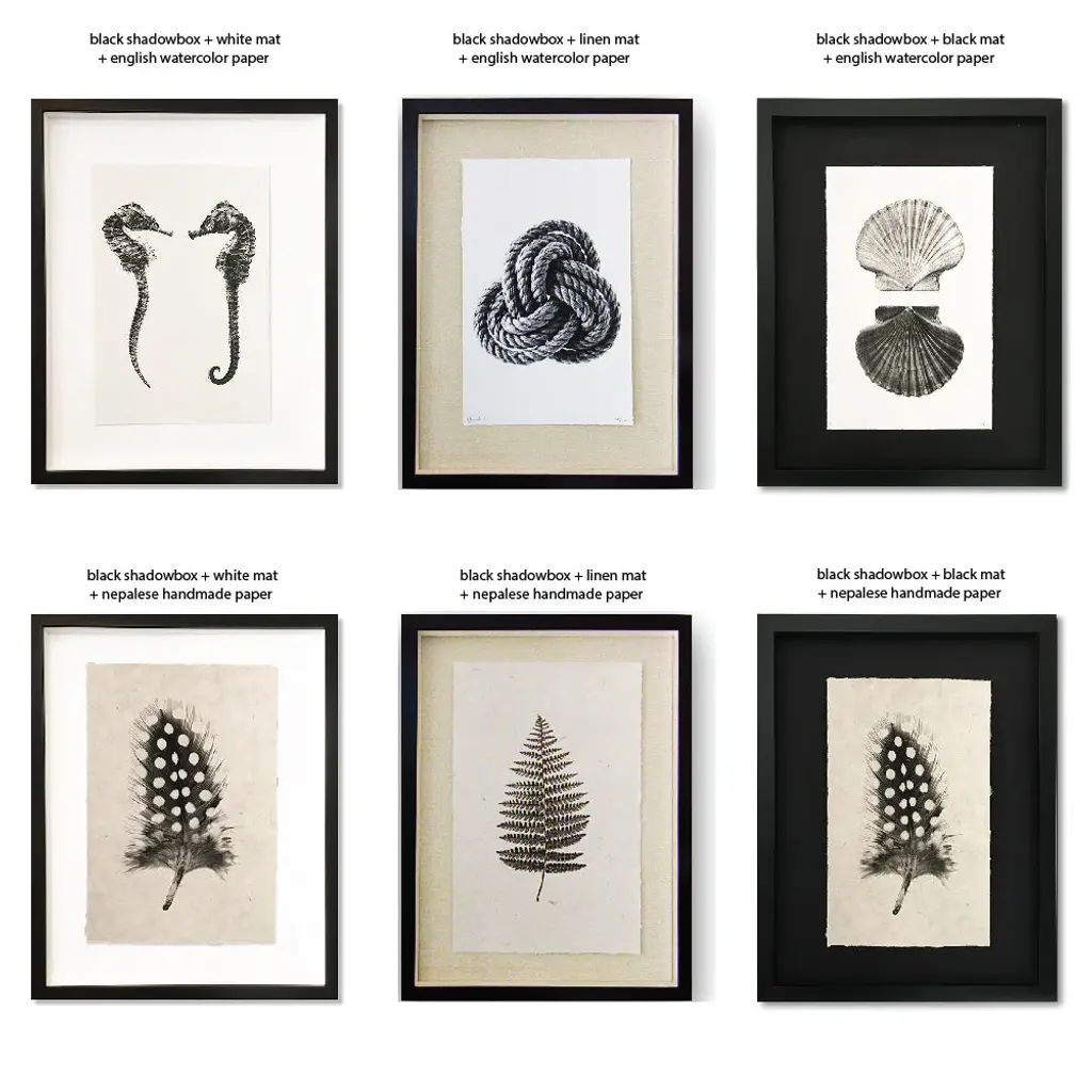 Inspired by their magnificent essence and diversity, a study of oysters and their intricacies are expertly replicated. Create a collection of multiples for a stunning art display. Art pieces can either be unframed (print only), or framed in a choice of archival wood frames or within an image clear acrylic frame. If unframed, a choice of additional “frameless” hanging options are available. The added-on framing options are shipped disassembled from the artwork. Hanging kits come complete with everything needed to hang a single print, including easy instructions. No damage is done to the print upon utilizing the hangers.