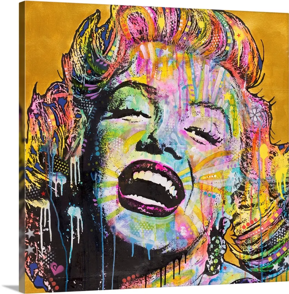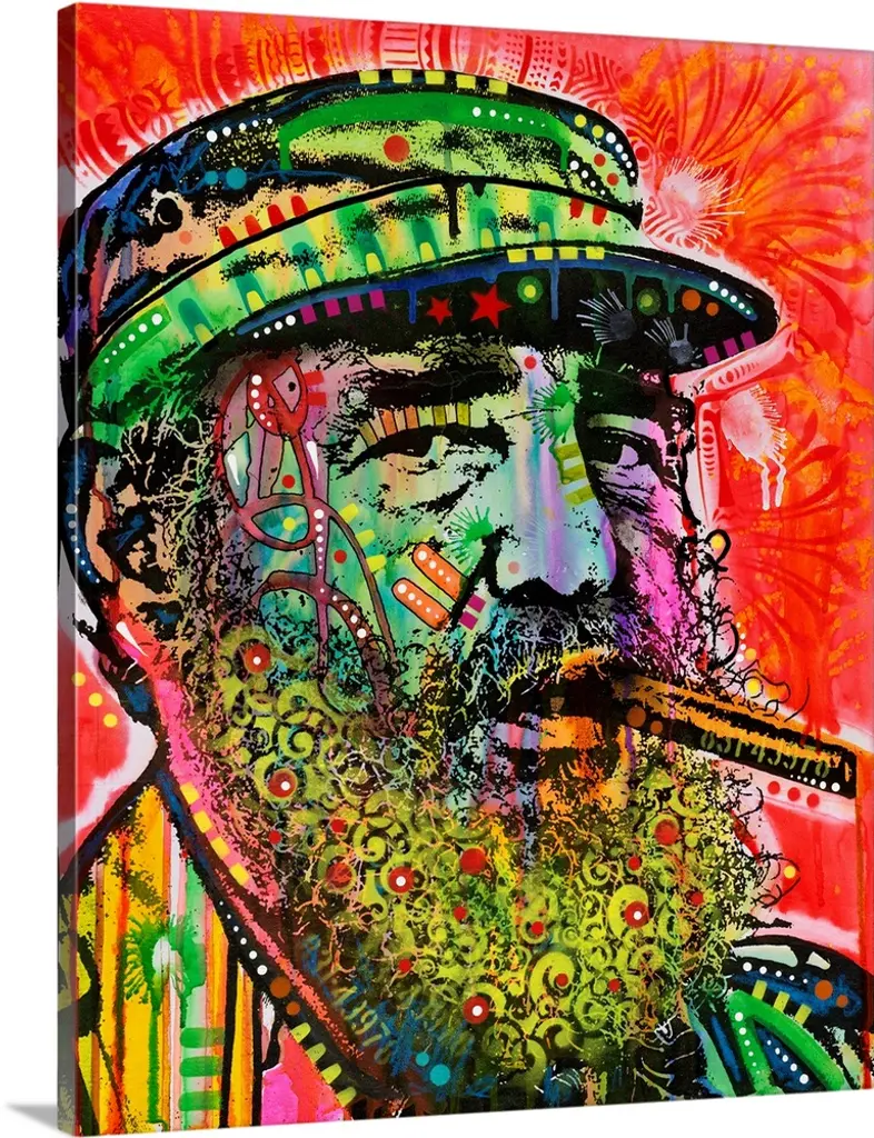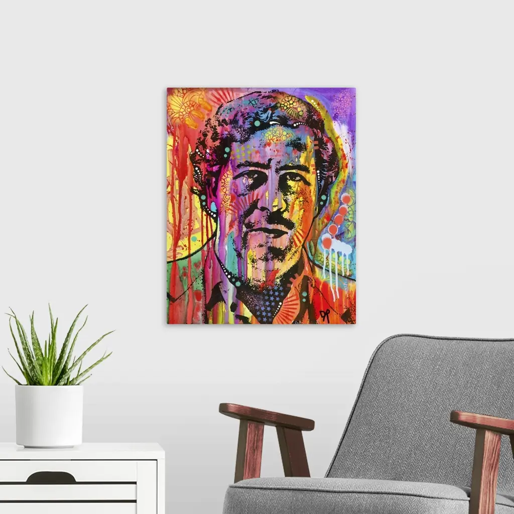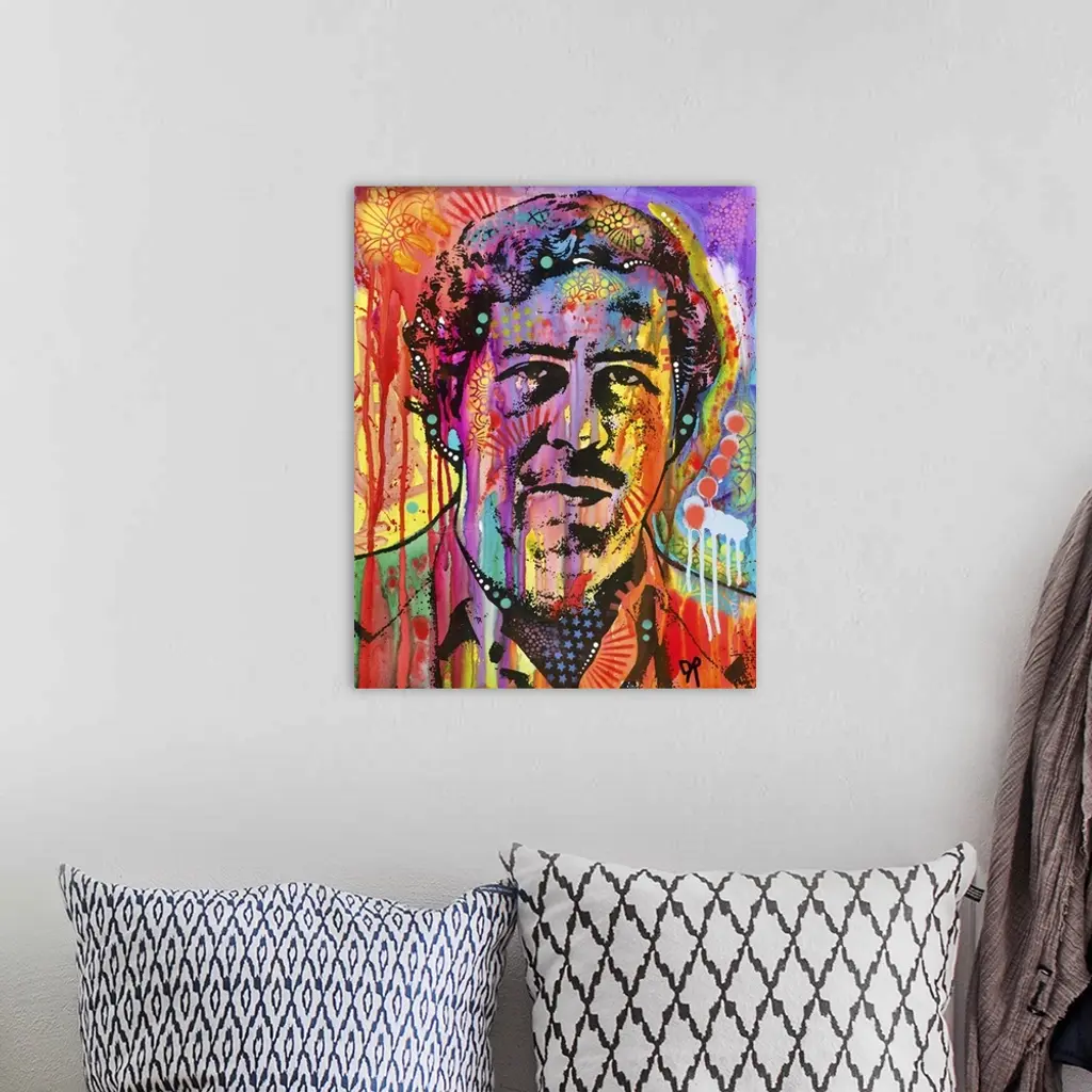 Pop art style painting of Pablo Escobar with abstract designs and paint dripping all over.
