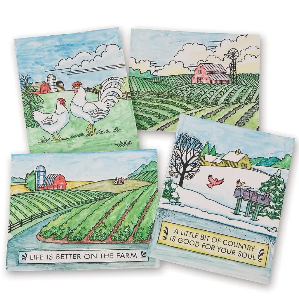 Painting a picture is as easy as brushing on the water – the paint’s on the paper! Four large 8” x 10” size farm and country scenes, 6 of each design on heavyweight cardstock. Self-adhesive easel backs for easy display. Brushes and instructions included.
