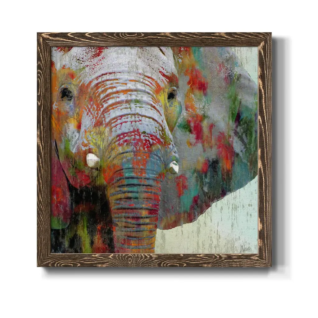 Paint Splash Elephant-Premium Framed Canvas - Ready to Hang Framed in distressed wood and available in an array of sizes and colors Each piece is joined and assembled by hand and comes ready to hang 2 INCH BEVELED MATTE BOARD PLEXIGLASS COVERING READY TO HANG MADE IN THE USA SOLID WOOD FRAME MADE IN USA FADE RESISTANT GICLEE PRINTING on Canvas or Paper
