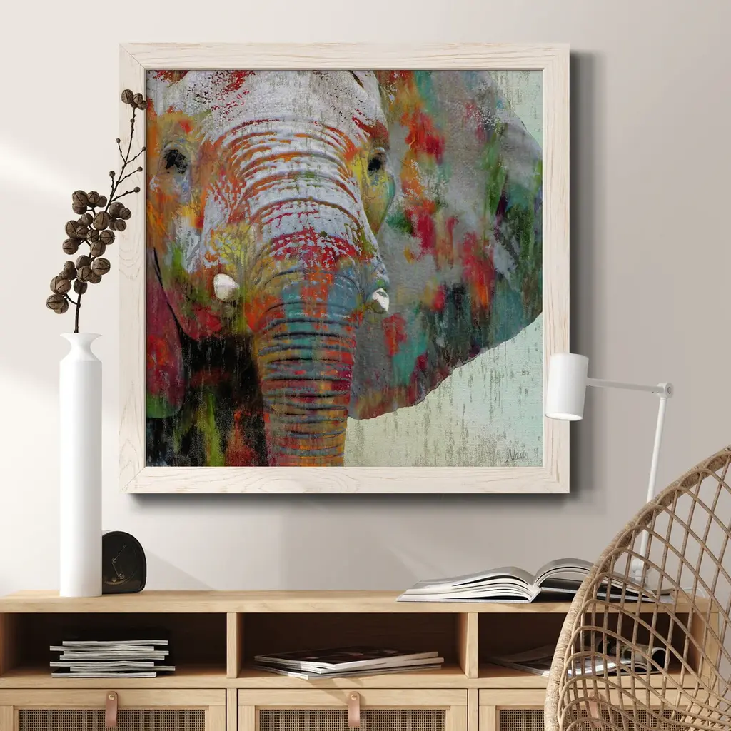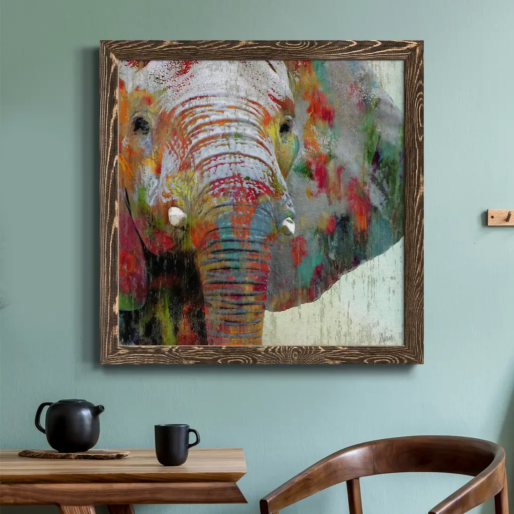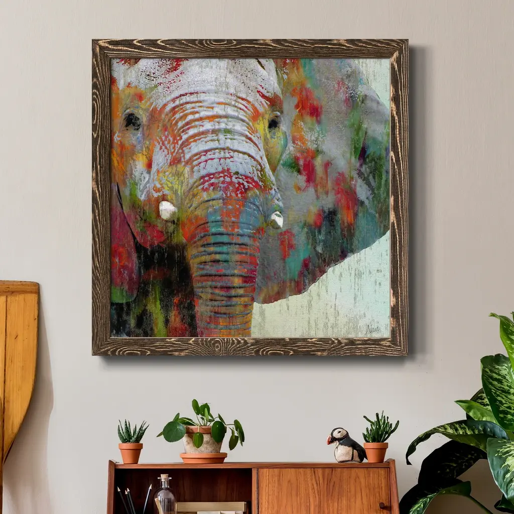 Paint Splash Elephant-Premium Framed Canvas - Ready to Hang Framed in distressed wood and available in an array of sizes and colors Each piece is joined and assembled by hand and comes ready to hang 2 INCH BEVELED MATTE BOARD PLEXIGLASS COVERING READY TO HANG MADE IN THE USA SOLID WOOD FRAME MADE IN USA FADE RESISTANT GICLEE PRINTING on Canvas or Paper