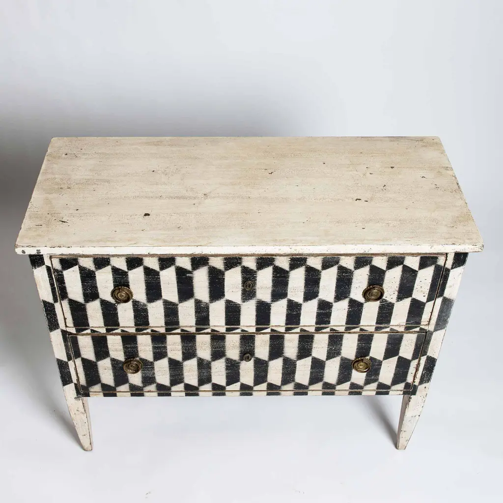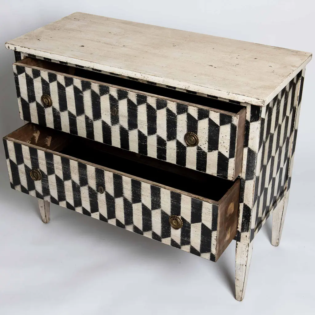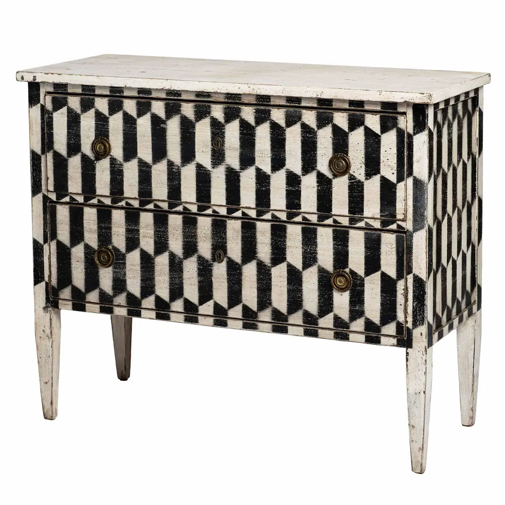 These 2-drawer chests were made by a husband and wife couple in Italy. He fabricates the chest using reclaimed wood and then she does the painting, resulting in a finished item that really looks vintage. The drawers are detailed with brass hardware and we love that the chests sit high on elongated and slightly tapered legs. There are 2 chests available; they are sold individually.