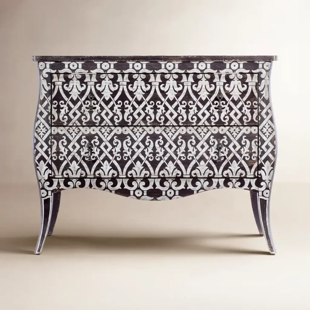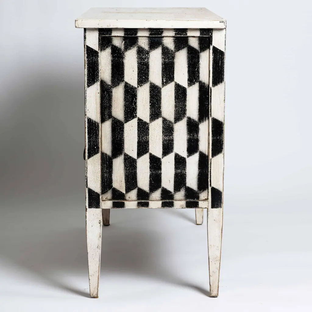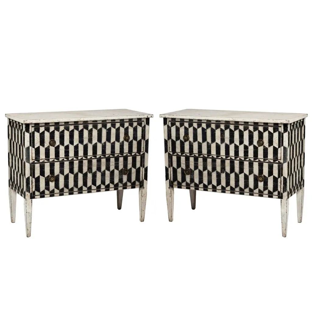 These 2-drawer chests were made by a husband and wife couple in Italy. He fabricates the chest using reclaimed wood and then she does the painting, resulting in a finished item that really looks vintage. The drawers are detailed with brass hardware and we love that the chests sit high on elongated and slightly tapered legs. There are 2 chests available; they are sold individually.