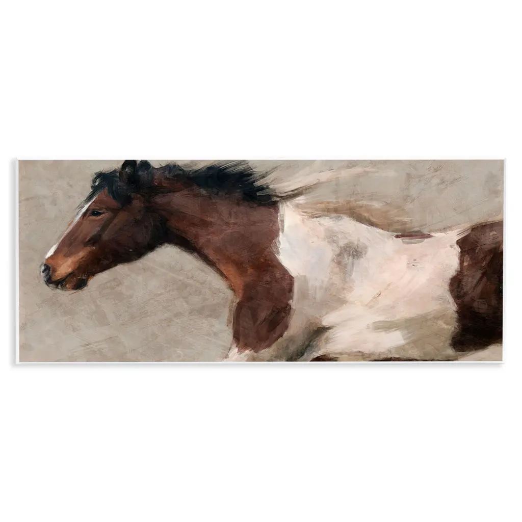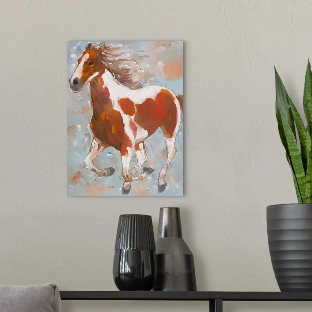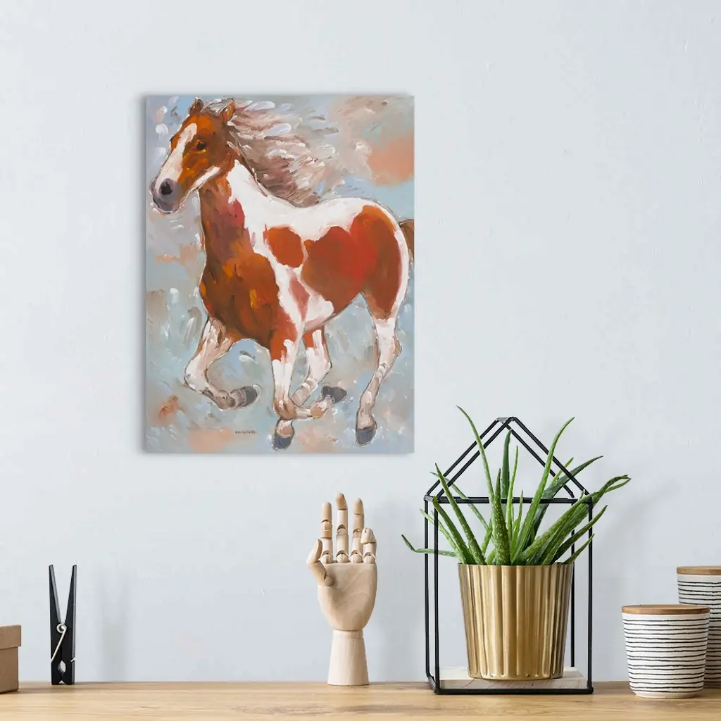 Contemporary painting of an orange, brown, and white galloping horse on a colorful pastel background.