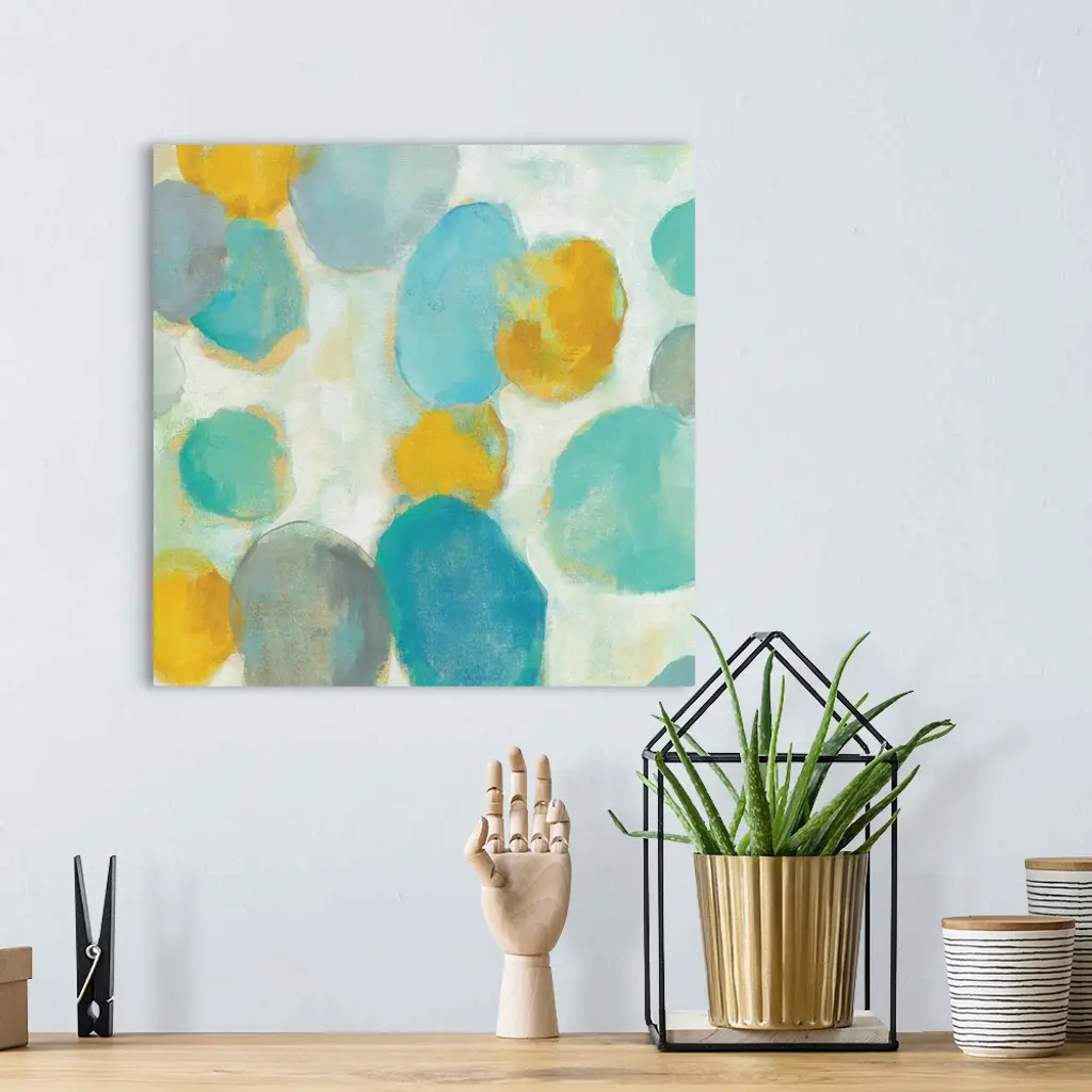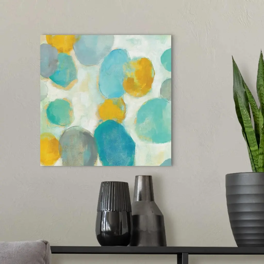 Abstract artwork of bright circle shapes in yellow and teal.