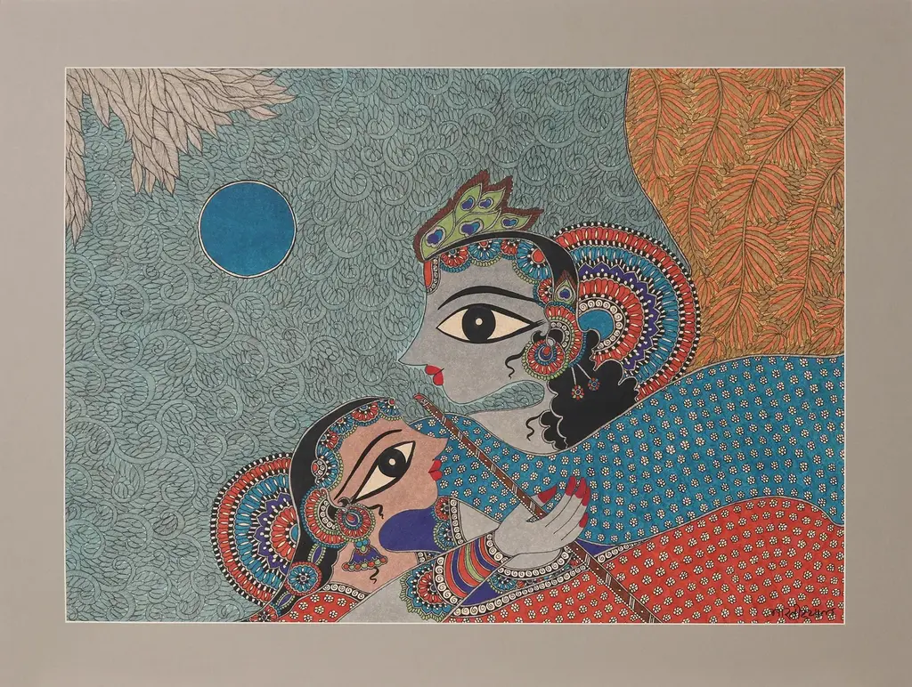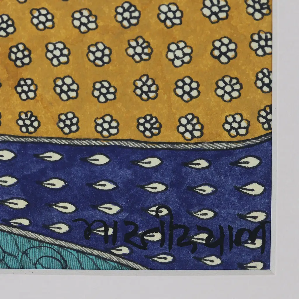 Love and kindness swirl with the prevailing winds of graceful Radha, the Hindu Mother Goddess and consort of God Krishna. Prominently standing out from the turquoise-blue sky and floral backdrop, Radha blissfully celebrates her role as chief consort of the Gopies together her closest friends, the Ashtasakhis. Reinterpreting the iconic Madhubani style of painting endemic to the region of Bihar, Indian artist Bharti Dayal paints 'Radha with Gopies' to consciously tell the story of her culture's origins, assigning each detail its own intellectual meaning. Internationally recognized for her resurrection of the Madhubani style which had previously suffered poor quality and a lack of originality, Dayal works to perpetuate classic themes beyond the scope of mere folk art while avoiding the mundane nature of contemporary recreations."Madhubani paintings are in fact a simplistic manifestation of the philosophical heights achieved by Indian civilization for the universal power of love, longing and peace; the quest of all beings," Dayal says.