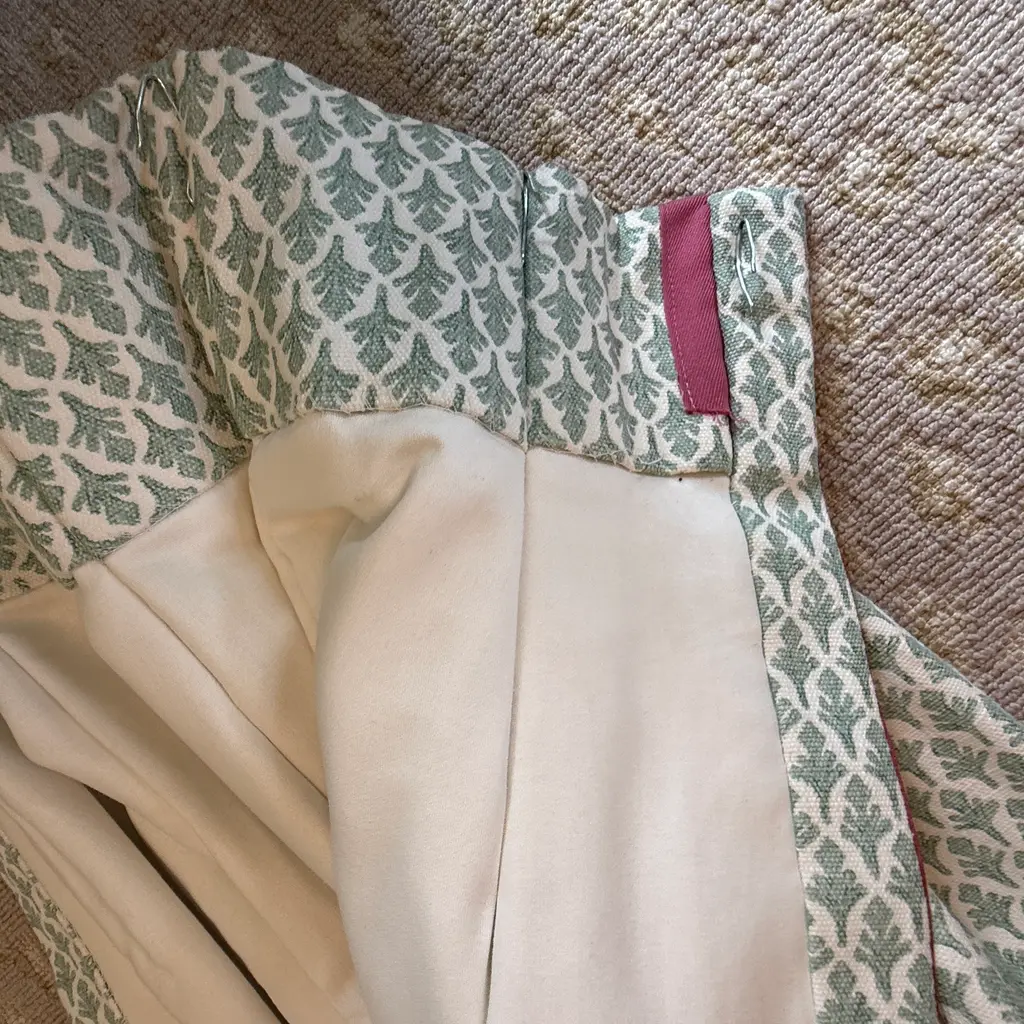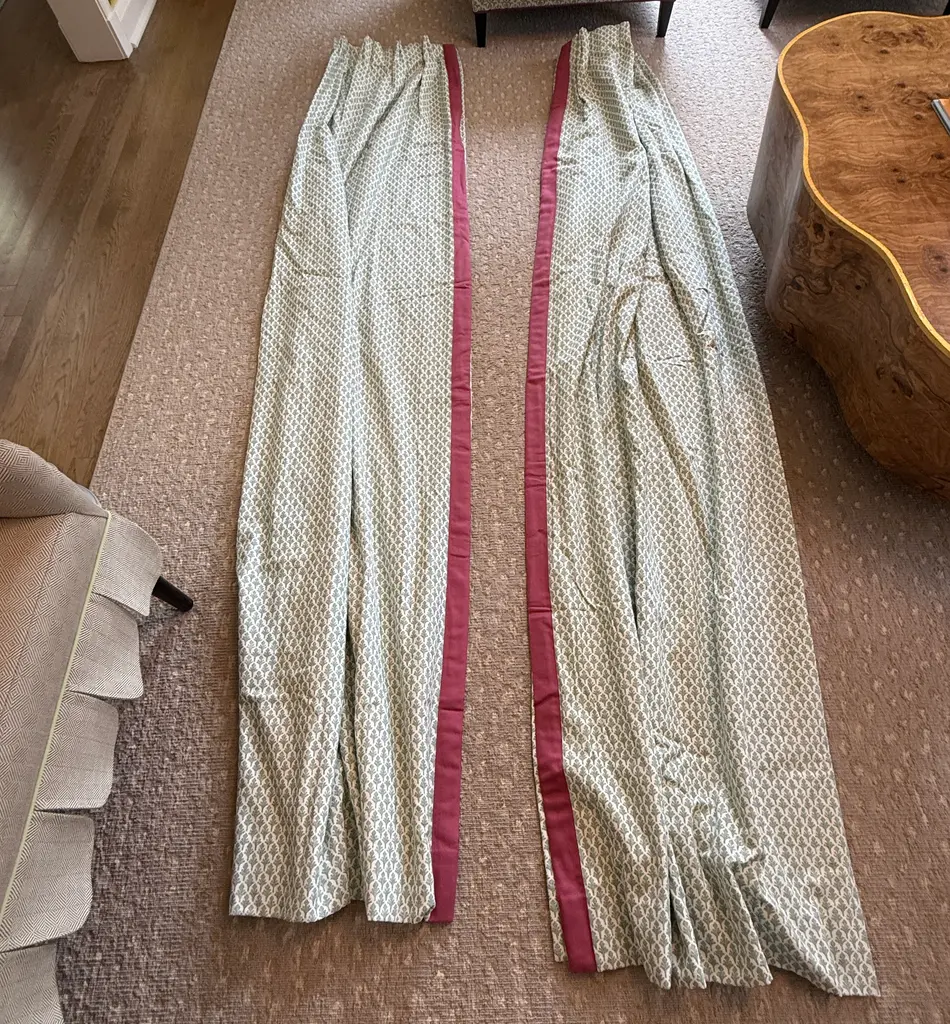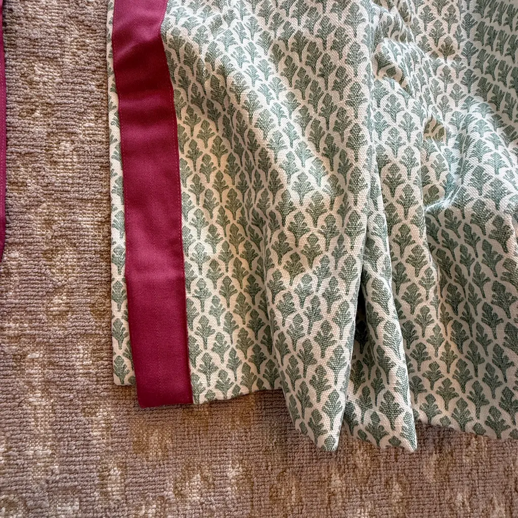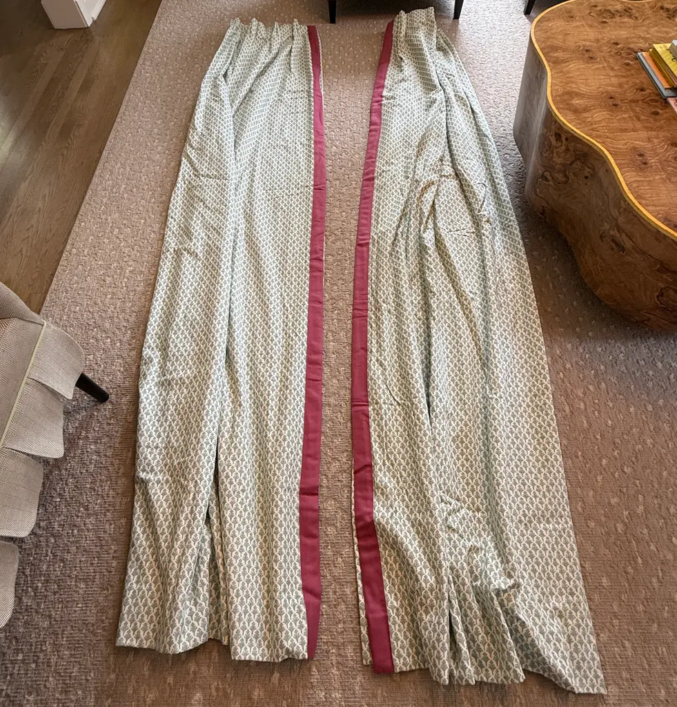 Pair Charming Block Print Panels with Trim; 2 pair available These are the absolute cutest panels! These are Lacefield Designs Ponce cotton/linen in the Eucalyptus colorway with wide fuschia trim. They are double lined and have 8 pinch pleats at the top. They were made for a home with 9’ ceilings. 107” l x 40” at top. 77” w at bottom with 4 inch hem We have two pair of these panels and are selling them per pair..