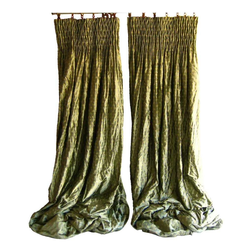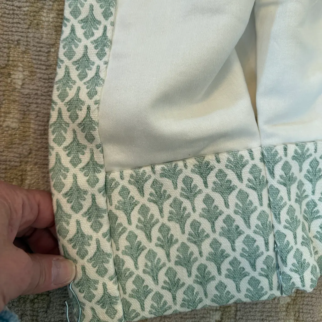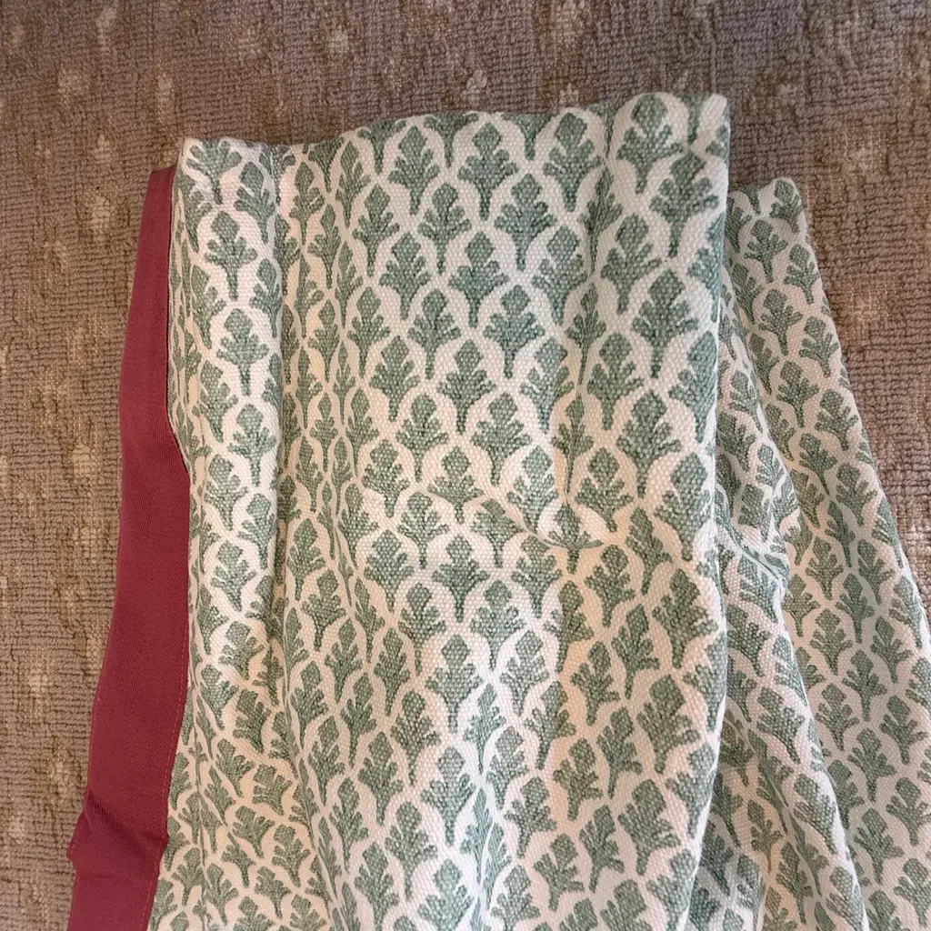 Pair Charming Block Print Panels with Trim; 2 pair available These are the absolute cutest panels! These are Lacefield Designs Ponce cotton/linen in the Eucalyptus colorway with wide fuschia trim. They are double lined and have 8 pinch pleats at the top. They were made for a home with 9’ ceilings. 107” l x 40” at top. 77” w at bottom with 4 inch hem We have two pair of these panels and are selling them per pair..