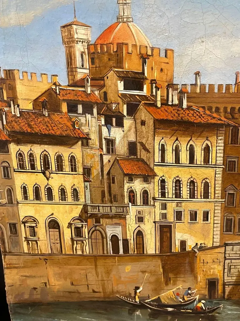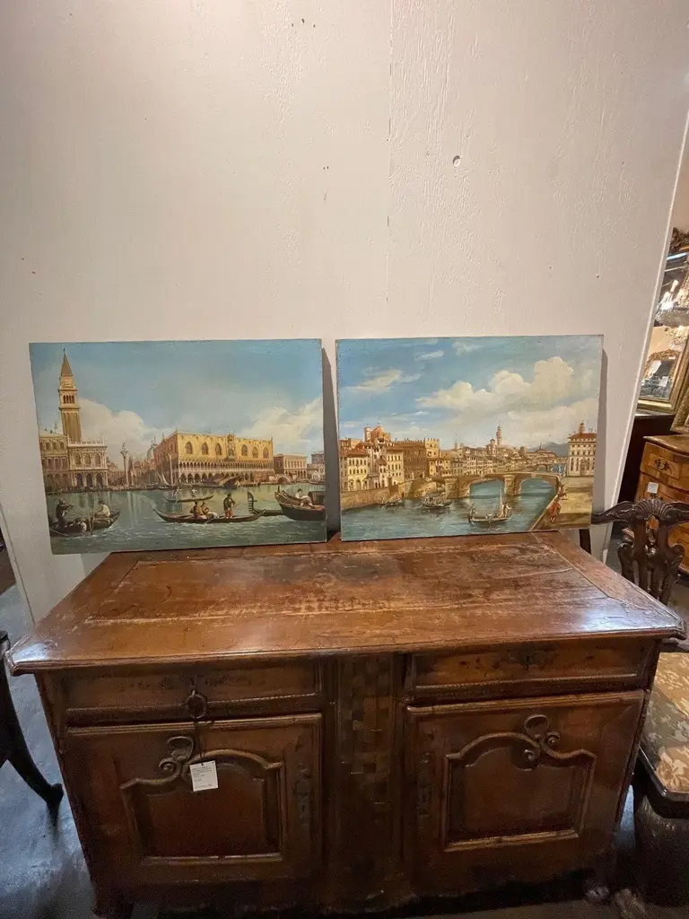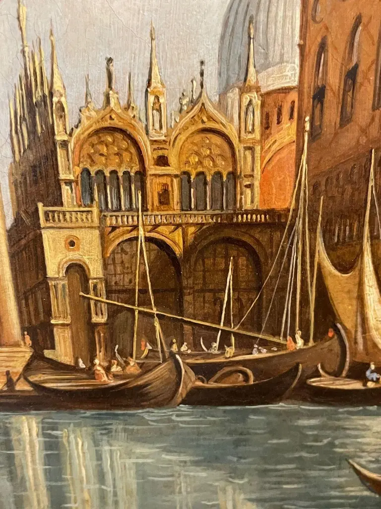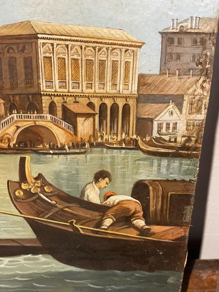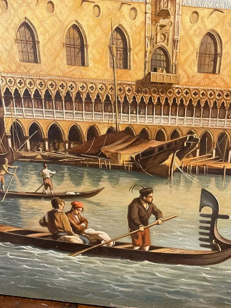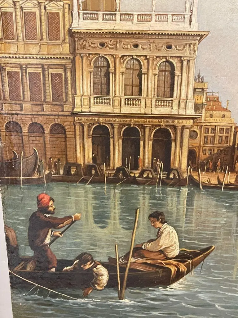 Rare pair of 19th century Venetian oil paintings on canvas. These paintings depict a Venetian harbor scene with boats, buildings and people. Very fine works of art!.