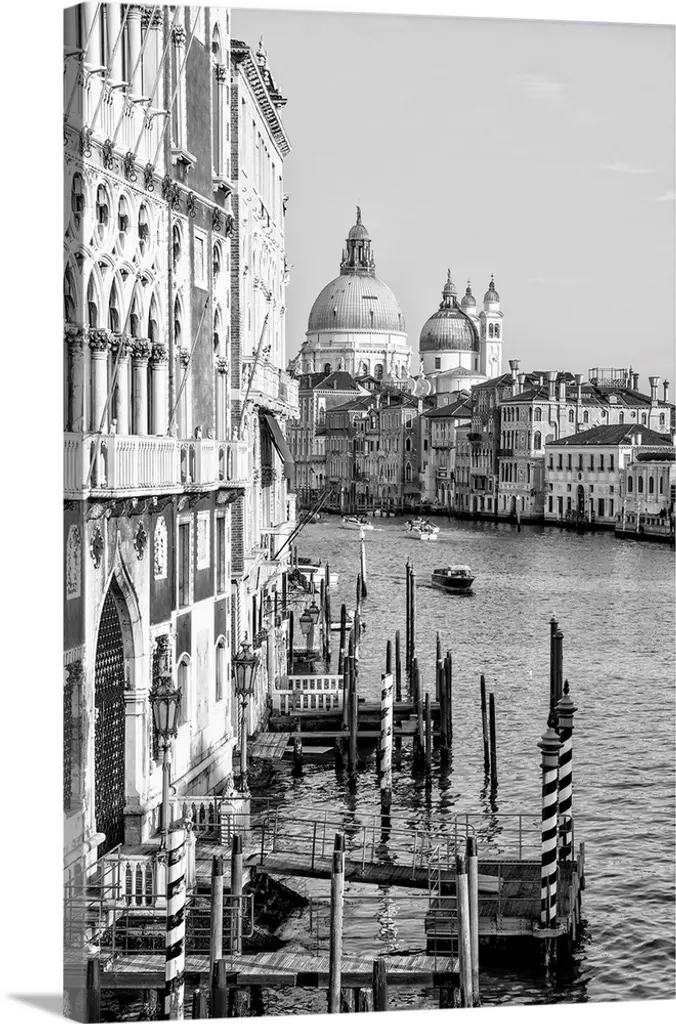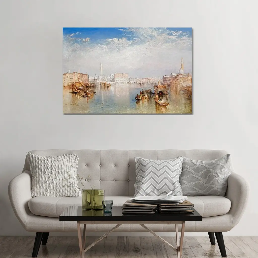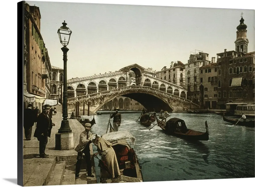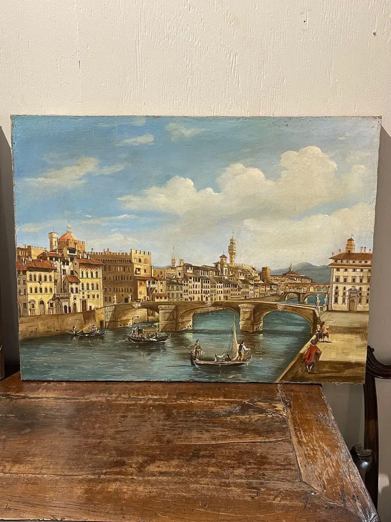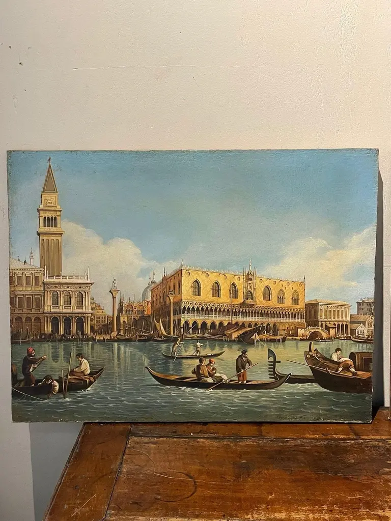 Rare pair of 19th century Venetian oil paintings on canvas. These paintings depict a Venetian harbor scene with boats, buildings and people. Very fine works of art!.