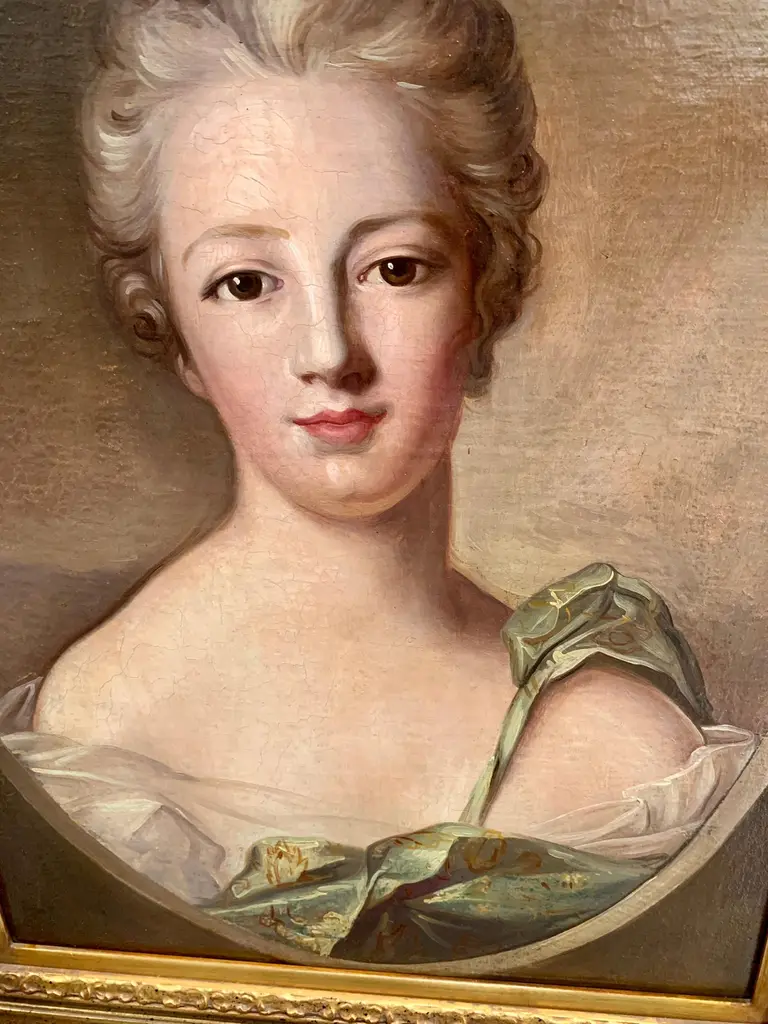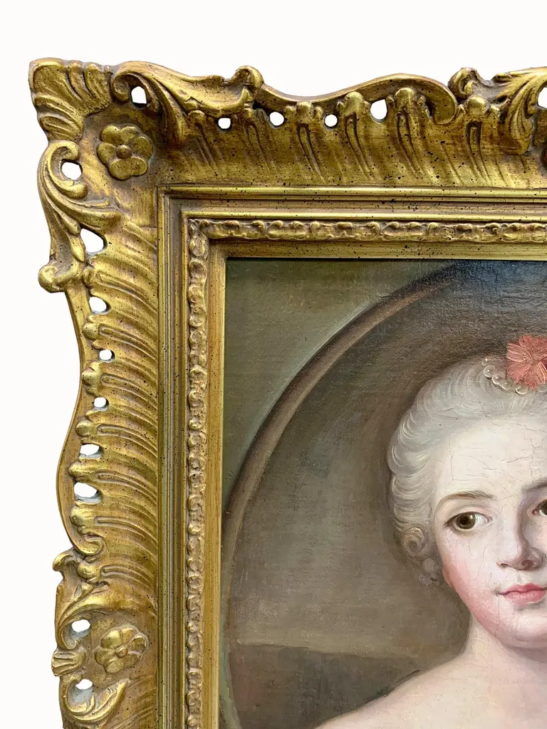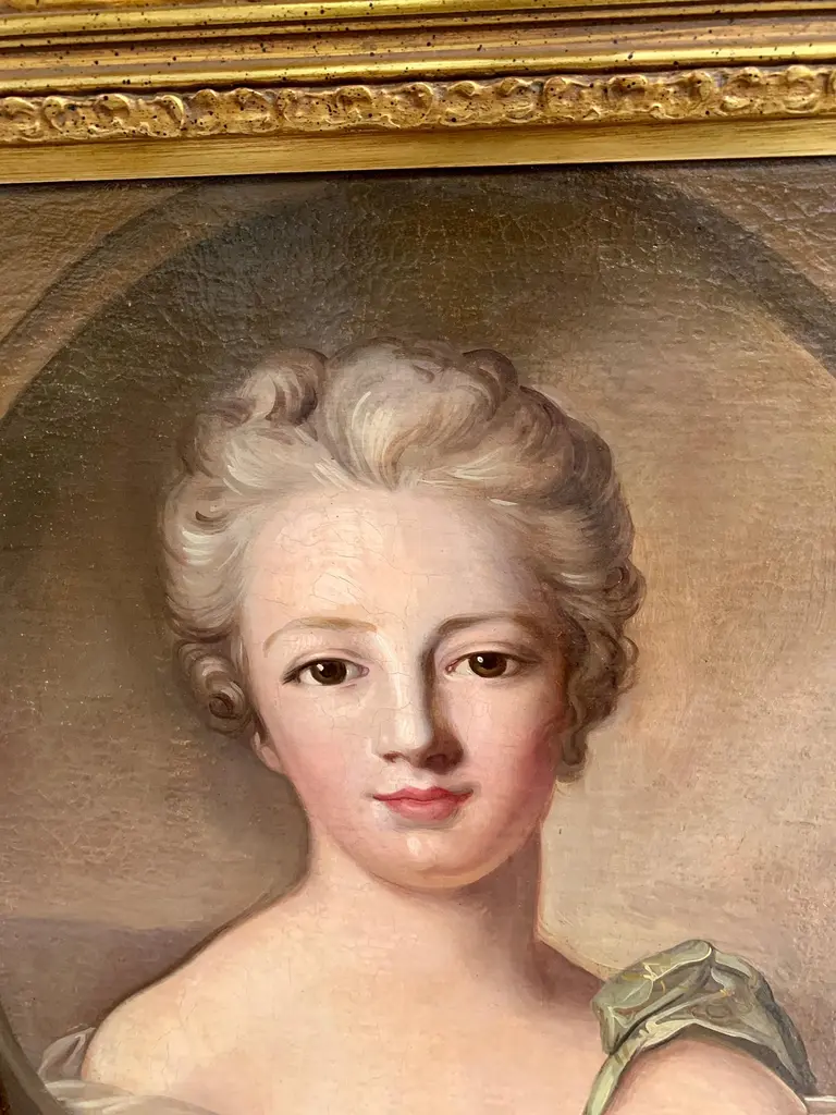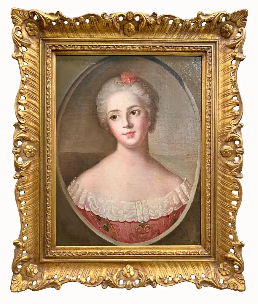 A charming pair of late 18th English century oil paintings on canvas. Each painting portrays a portrait of a young lady in oval within carved giltwood frame. Circa 1790Dimensions:Frame: 27.5" x 23"Canvas: 20" x 15"Bears a Poulsen Galleries Pasadena label.