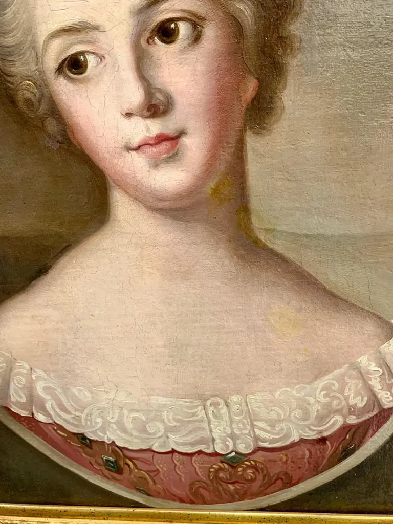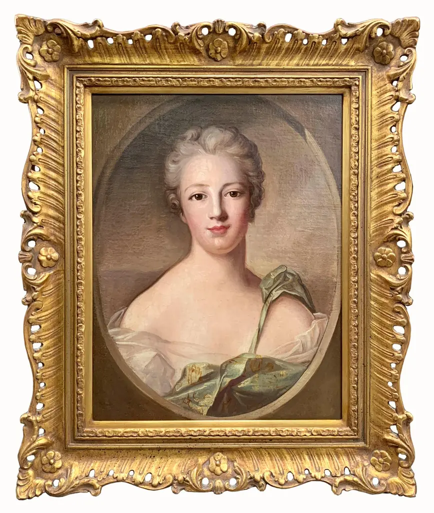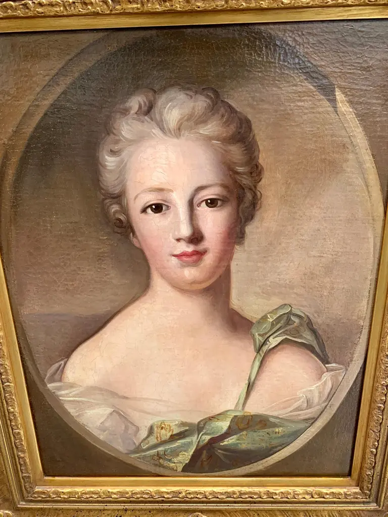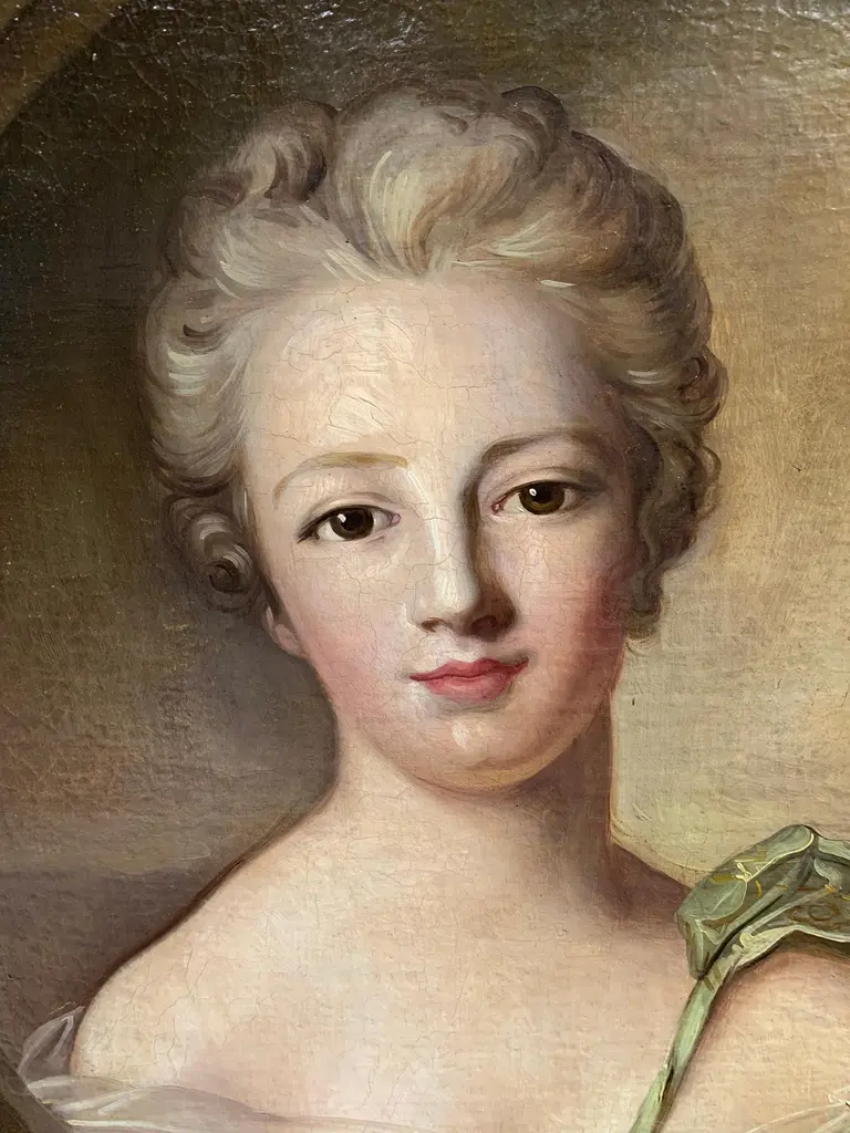A charming pair of late 18th English century oil paintings on canvas. Each painting portrays a portrait of a young lady in oval within carved giltwood frame. Circa 1790Dimensions:Frame: 27.5" x 23"Canvas: 20" x 15"Bears a Poulsen Galleries Pasadena label.