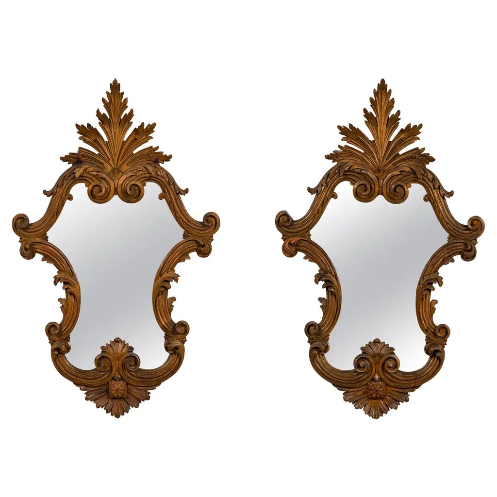 A pair of Italian carved giltwood wall decorations from the early 19th century, with scrolling foliage. Created in Italy during the first quarter of the 19th century, this pair of wall carvings depicts scrolling foliage gracefully extending its leaves upwards. Nicely symmetrical, this pair of Italian giltwood wall carvings circa 1820 will bring a touch of undeniable elegance to any home, perhaps hung above a pair of demilune tables or a credenza!