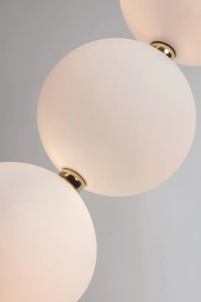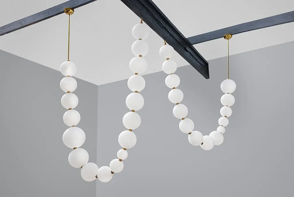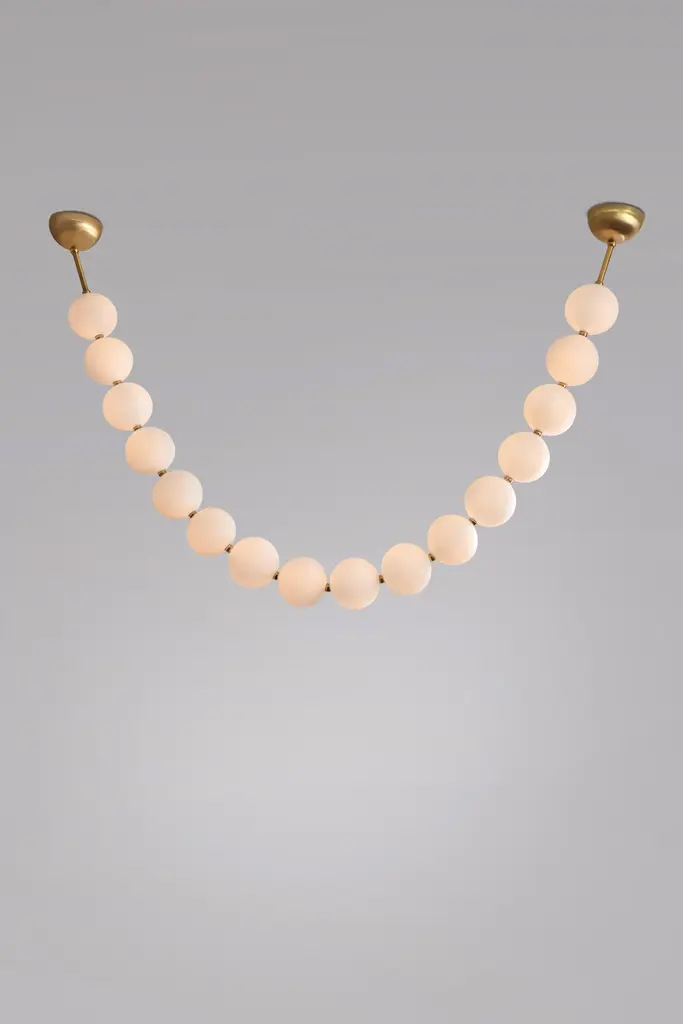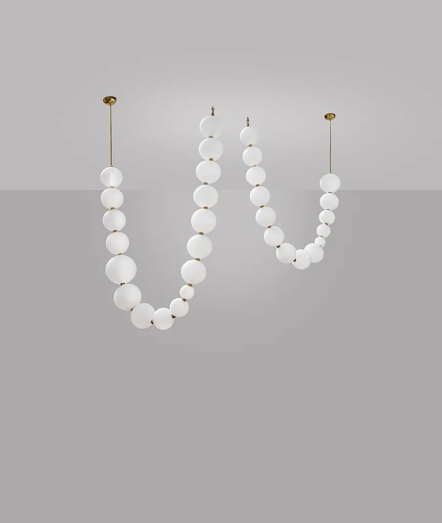 Pair of pearl necklace pendant lights - Ludovic Clément d’ArmontEvery creation of Ludovic Clément d’Armont can be made to order in any requested dimensions. Please contact us for custom-made creations.Blown glass and brassDimensions: glass diameter 8-20cmH120 x 130 x 20 cm and H 150 x 150 x 20 cm (adjustable)Every creation is created especially for a project.This listing is for : pearls of 10, 12, 14, 16, and 18cmwidth : 175cm of the total necklaceheight: H 75cm distance between the 2 hooks : 100cmLudovic Clement d’Armont is in the continuation of a family tradition of centuries of gentle glassmakers, painters, carpenters and artists. Both engineer and artist, he imagines new lightings combining creative emotions with optical, electronic, thermal, environmental, electrical, chemical, color, energy, mechanical and medical knowledge. His pleasure is to discuss with his clients to achieve the ideal model. Ludovic presents his approach: “First, the simplicity of my work is based on a fundamental thought: an artistic evocation of nature. My creative process marks the new identity of mathematics and nature: the selective experimentation of nature and human research lead to the same decisions. That is why, analysis and experimentation mingle in my creation. Because the intelligence of nature is only the long time of his experiments, just like that of man is only the number of its research. The aesthetic result aims to illustrate and proclaim this, in a dreamy and amazed shout, showing the fusion of sciences and life. The place of the Man inside the Universe becomes clear. Emotions and sexes are the result by elimination aiming to perpetuate: without absolute, humanism becomes the demonstrated organization of society.”Semeur d’étoiles gathers around Ludovic Clement d’Armont artists, engineers and craftsmen to design and manufacture exceptional light creations. As decorative lighting is often disappointing, Semeur d’étoiles creates more than just lightings: we make art pieces. Semeur d’étoiles is not limited to a material or a technique: we find new ways of manufacturing blown glass, crystal, porcelain, metal. Simultaneously, we work the light in theoretical and experimental ways so that it echoes with these materials, textures and shapes. This enables us to offer new and various light effects. To put these effects in volume, Semeur d’étoiles relies on its mastery of technical complexity. Nevertheless, we hide the technical components so that only the beauty of light and materials can be seen. Semeur d’étoiles is committed to an eco-design approach with Ademe (recyclable materials, manufacturing processes, reduced packaging, transportation, reduced consumption, recycling). And as ecology is nothing without human respect, Semeur d’étoiles also takes great care of supply. A creation can result of your own inspiration: each of our pieces can be customized. We propose numerous models of LEDs (a variety of shades of white, lens shapes and light intensities), a wide range of materials, dimensions, shapes, finishes, etc. If you wish, we will create for you a unique and spectacular piece. The originality of our creations and our technical skills are evidenced by the loyalty of our customers, by our internal laboratory, by the grant of patents and models, and by the obtained distinctions.
