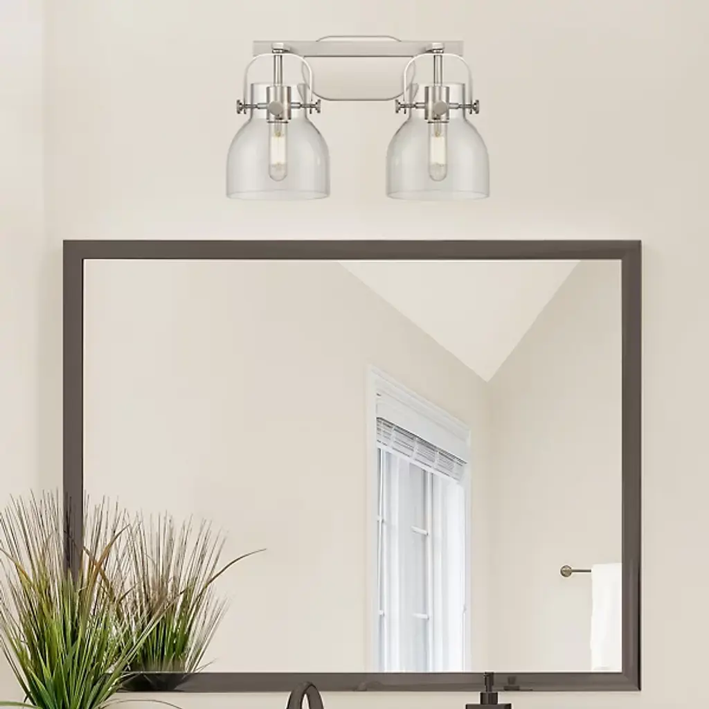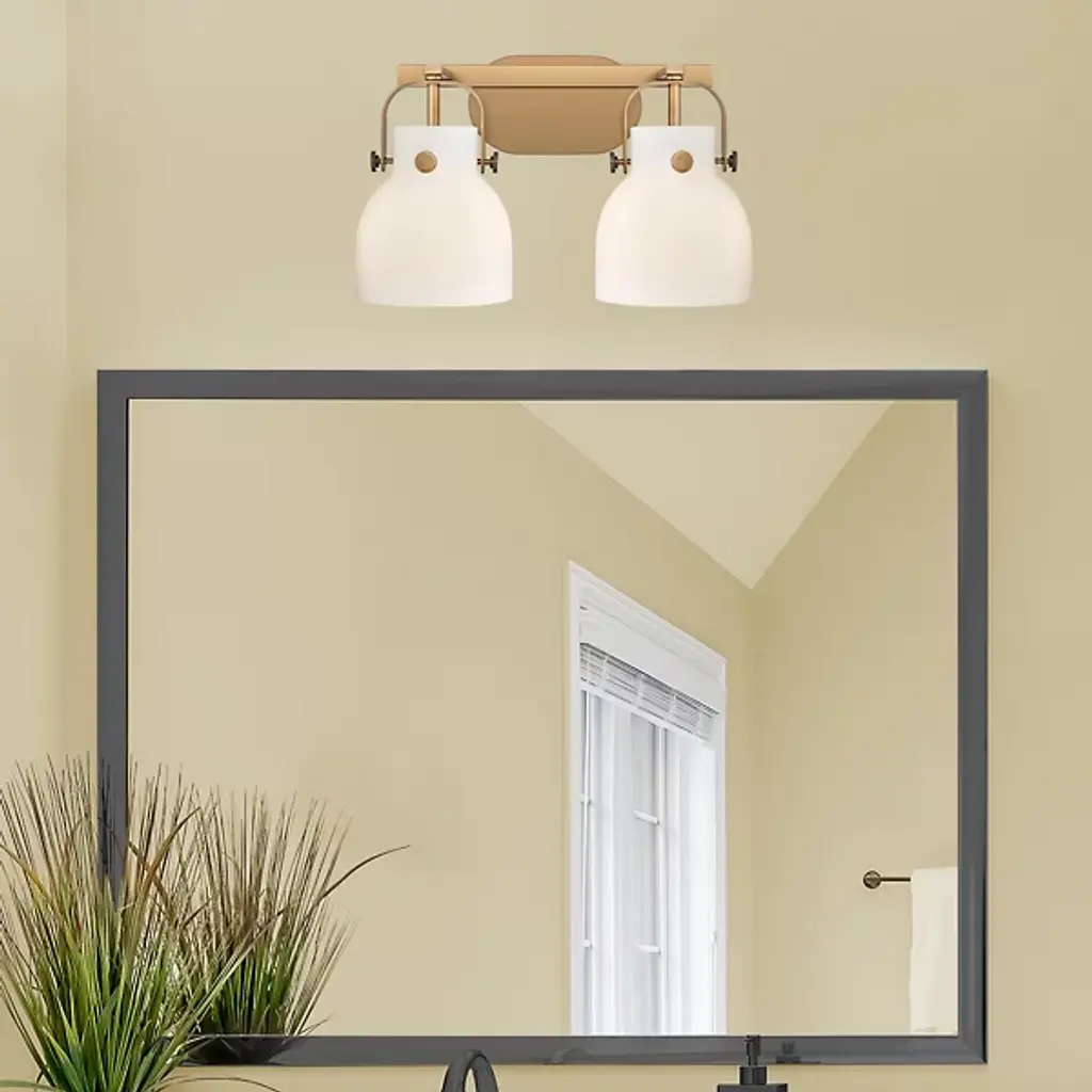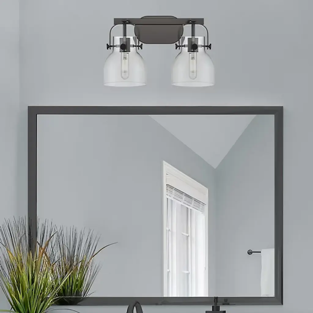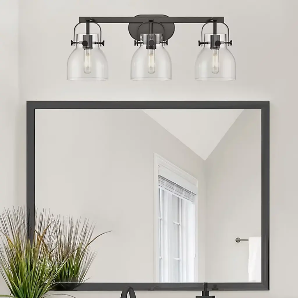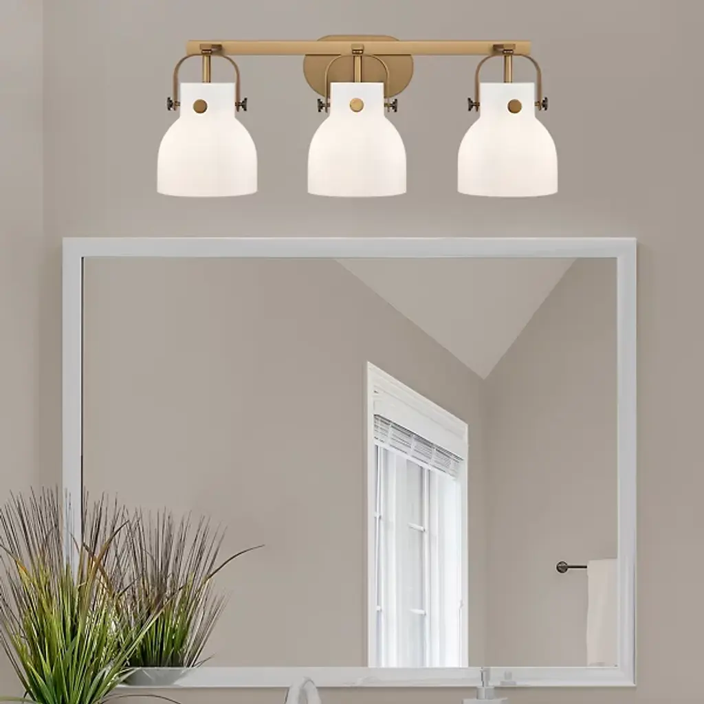 Industrial-inspired lighting for the modern bathroom. The Paisley Bell Vanity Light by Alder & Ore has bell-shaped glass shades that are held along and away from the metal bar by eye-catching yoke-style assemblies. Metal pins hold the shades securely to their holders and add further decorative detailing to the overall fixture. The distinctive design of this vanity light makes it an appealing focal point over the mirror in any modern bath or vanity area.