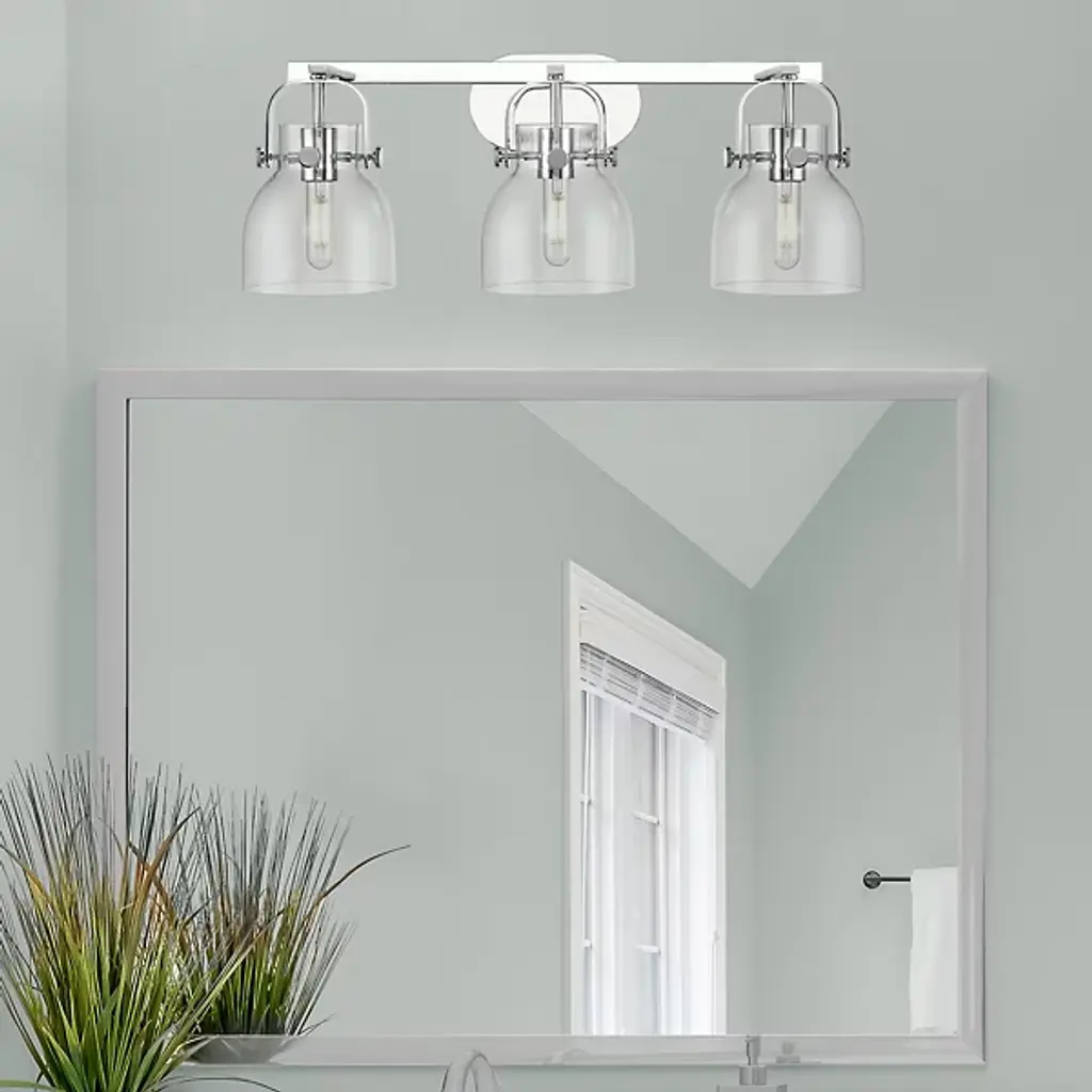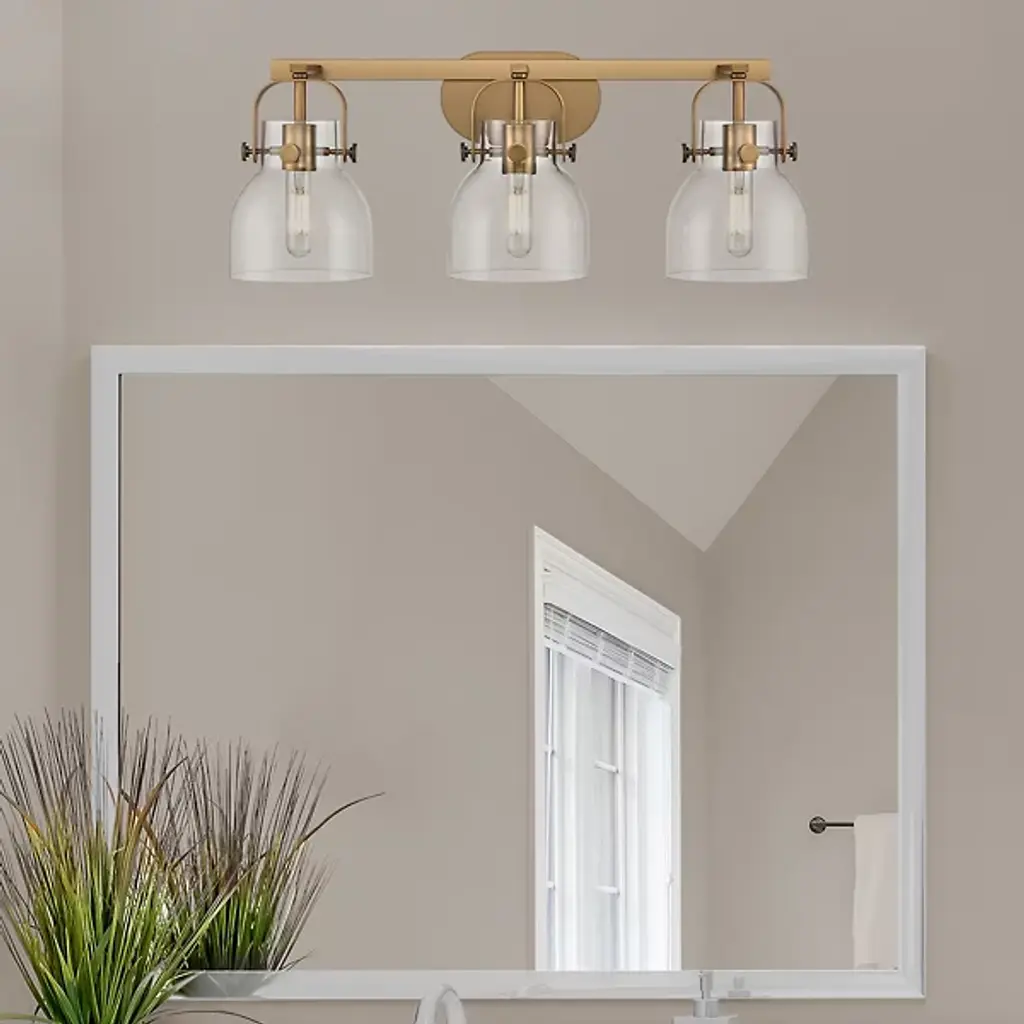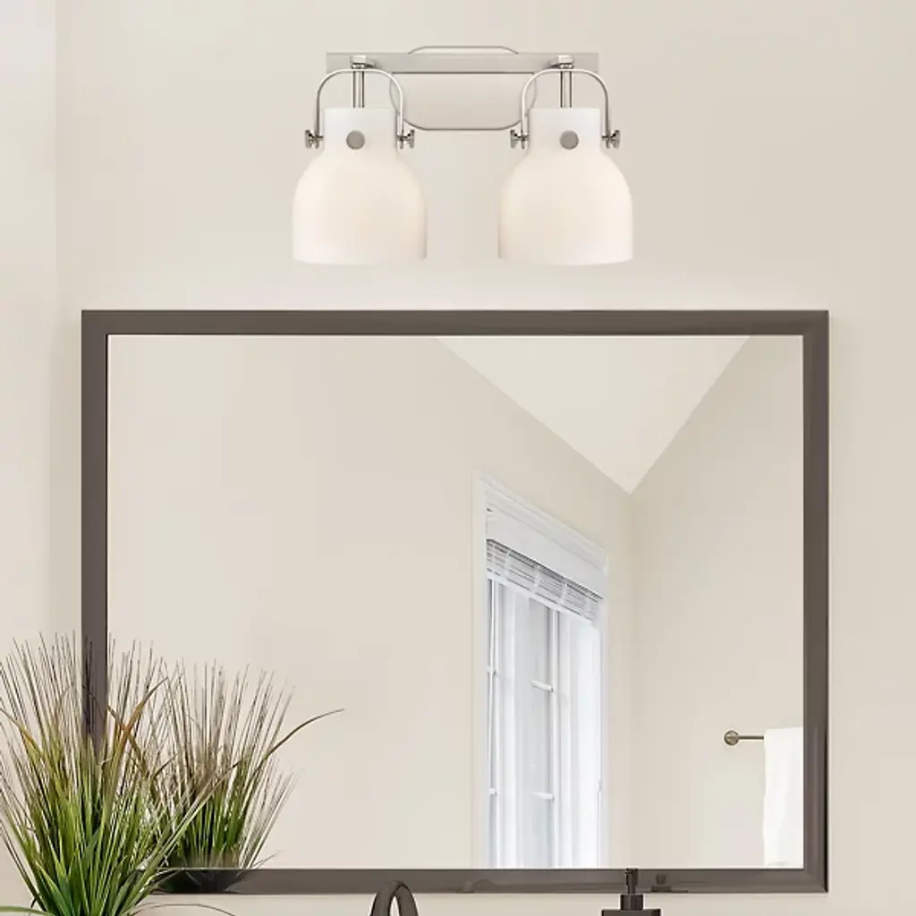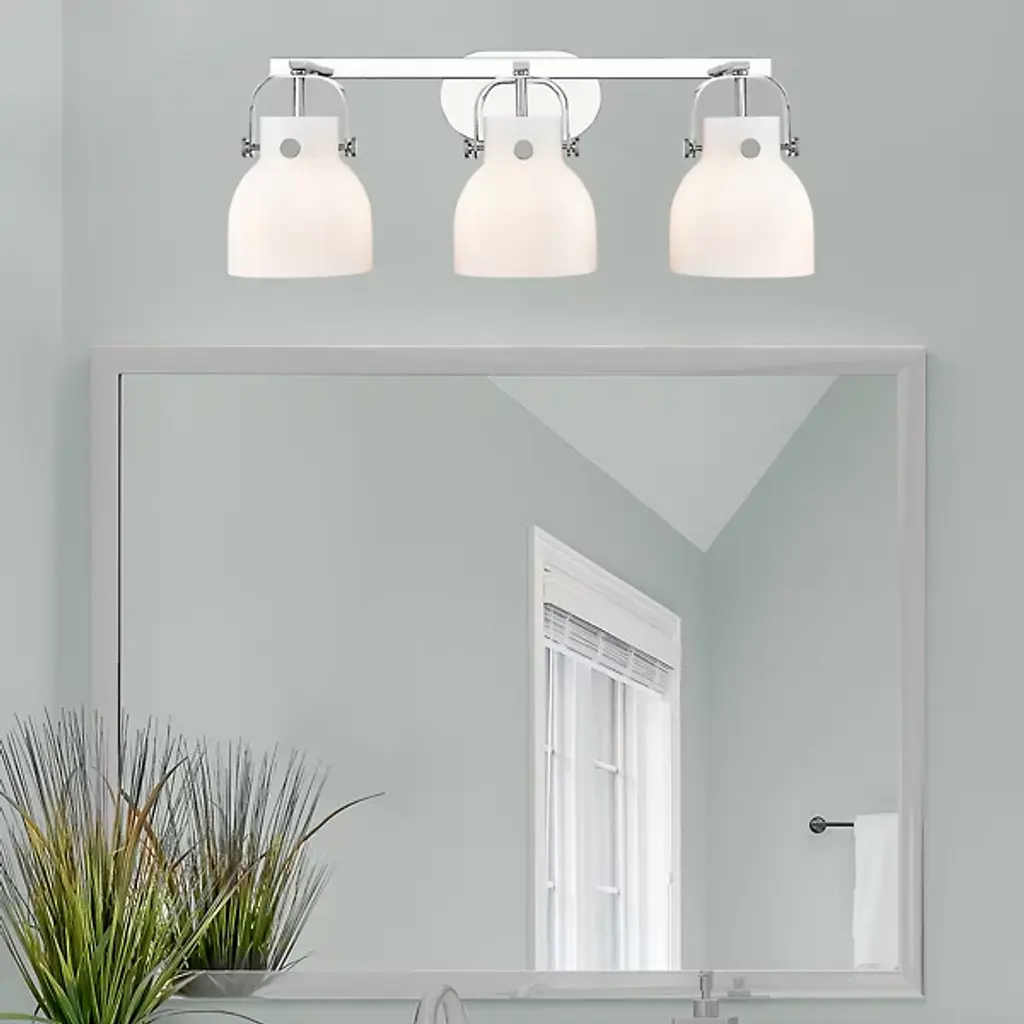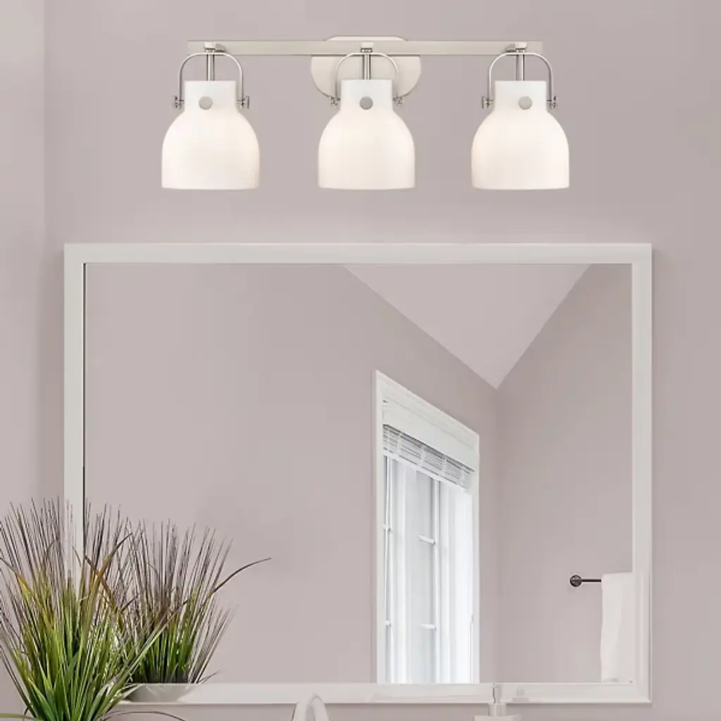 Industrial-inspired lighting for the modern bathroom. The Paisley Bell Vanity Light by Alder & Ore has bell-shaped glass shades that are held along and away from the metal bar by eye-catching yoke-style assemblies. Metal pins hold the shades securely to their holders and add further decorative detailing to the overall fixture. The distinctive design of this vanity light makes it an appealing focal point over the mirror in any modern bath or vanity area.