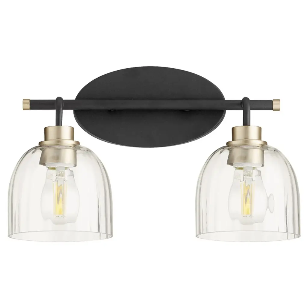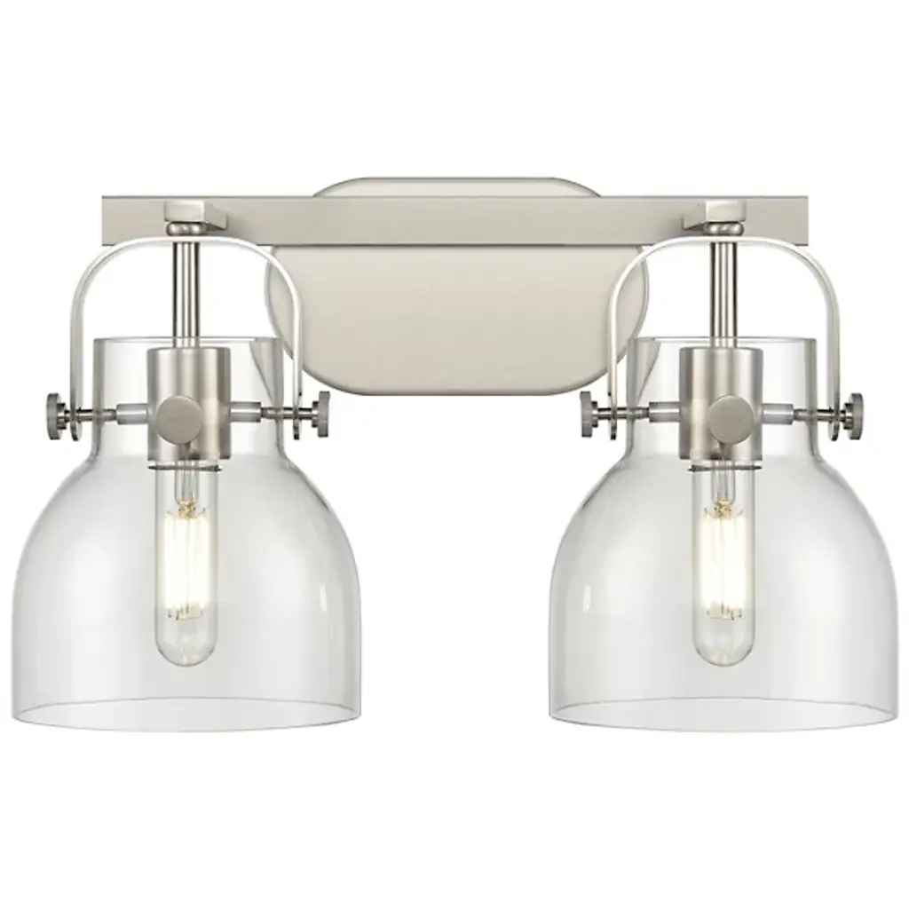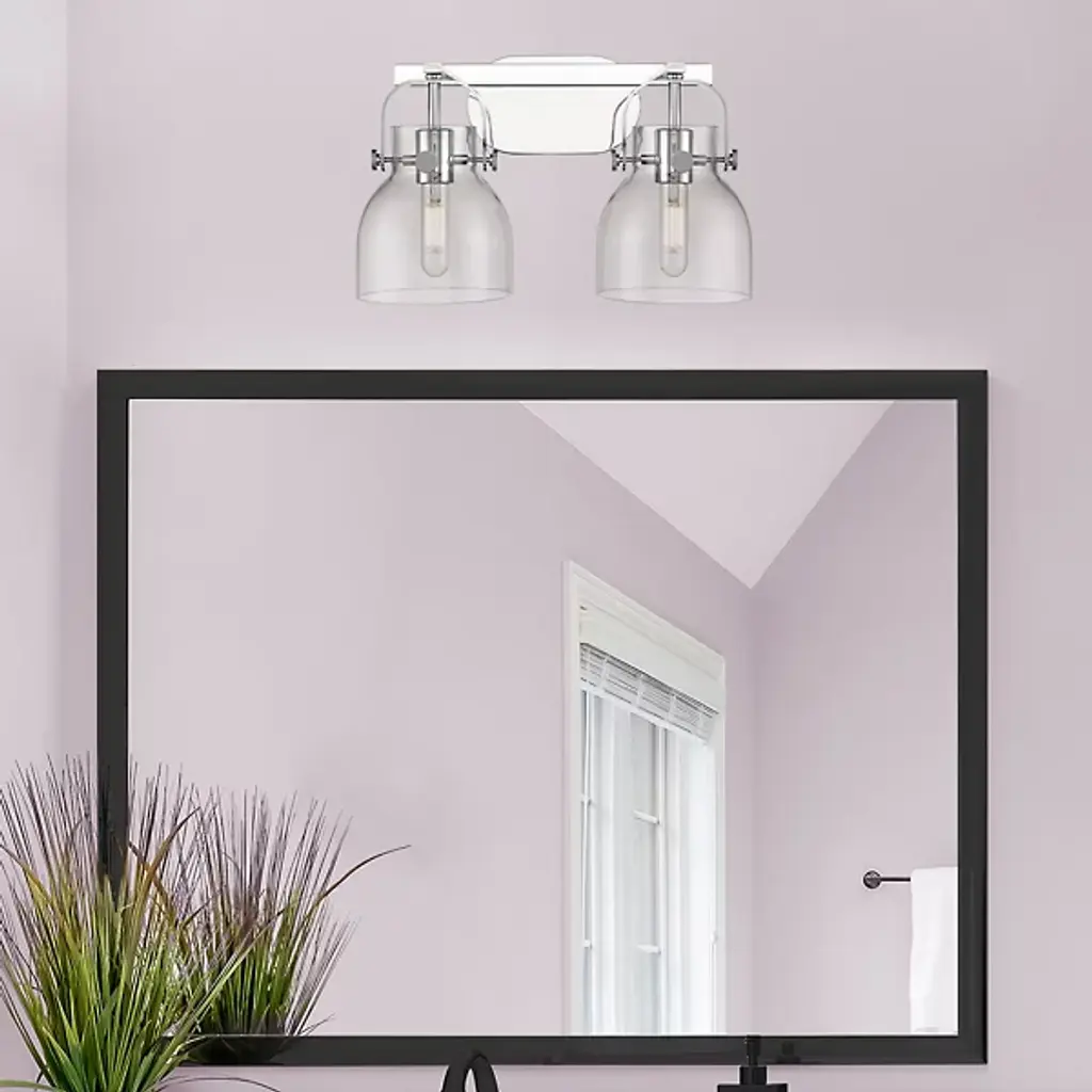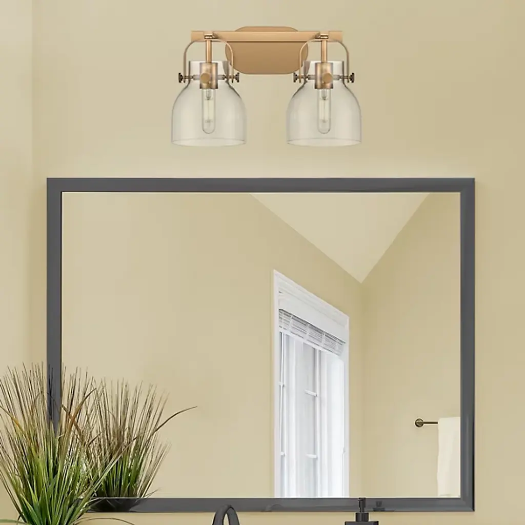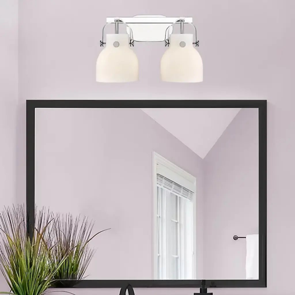 Industrial-inspired lighting for the modern bathroom. The Paisley Bell Vanity Light by Alder & Ore has bell-shaped glass shades that are held along and away from the metal bar by eye-catching yoke-style assemblies. Metal pins hold the shades securely to their holders and add further decorative detailing to the overall fixture. The distinctive design of this vanity light makes it an appealing focal point over the mirror in any modern bath or vanity area.