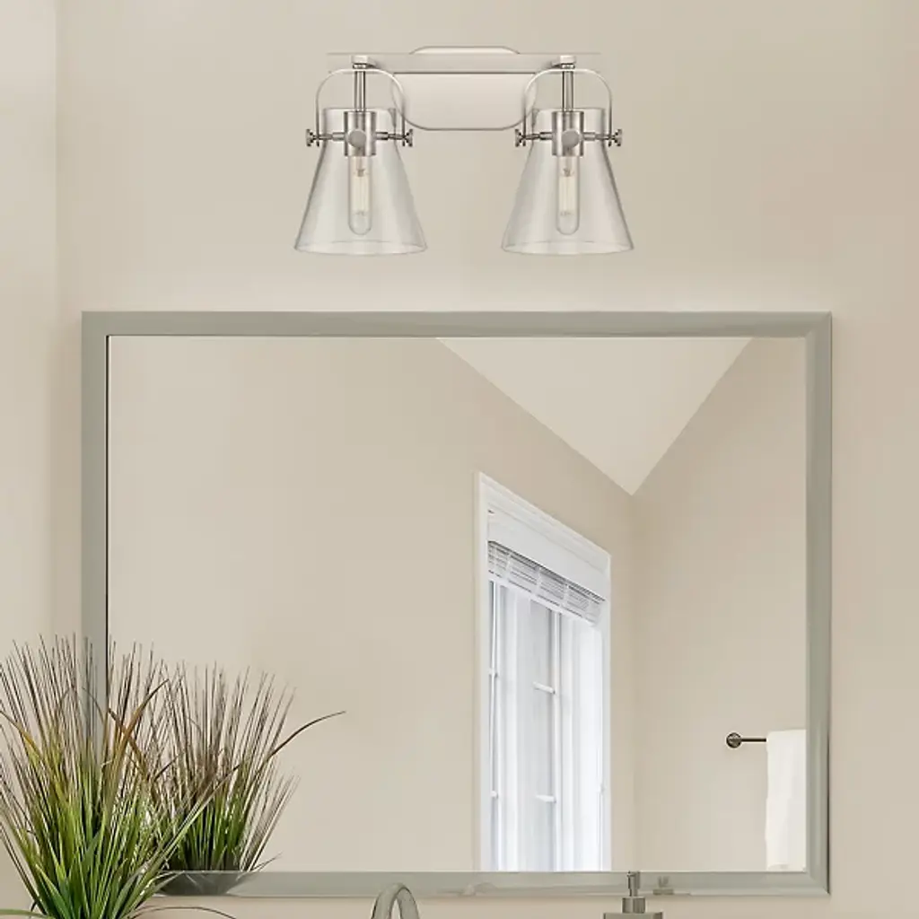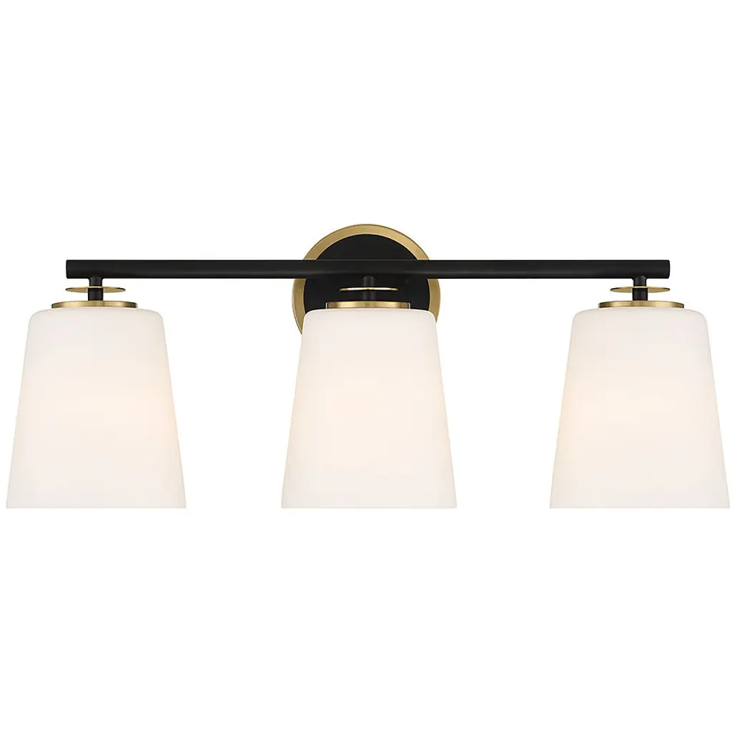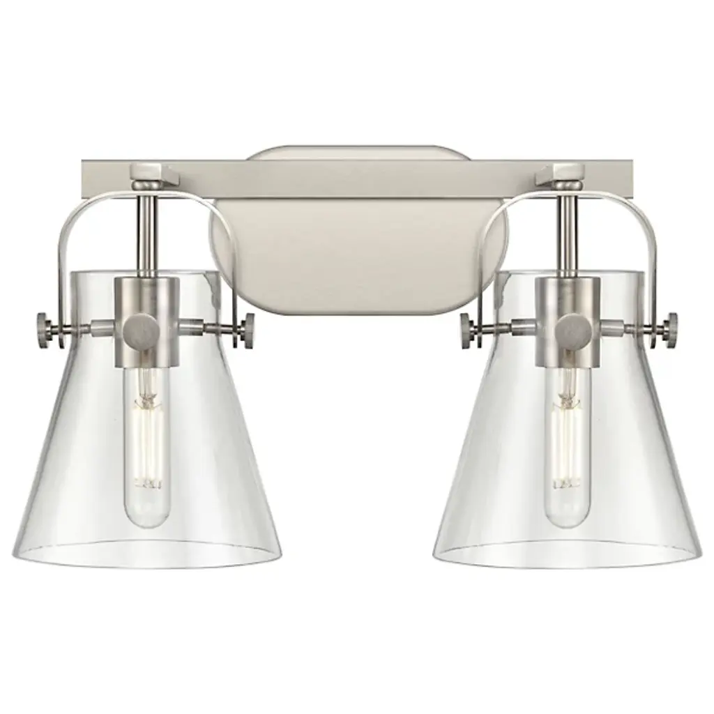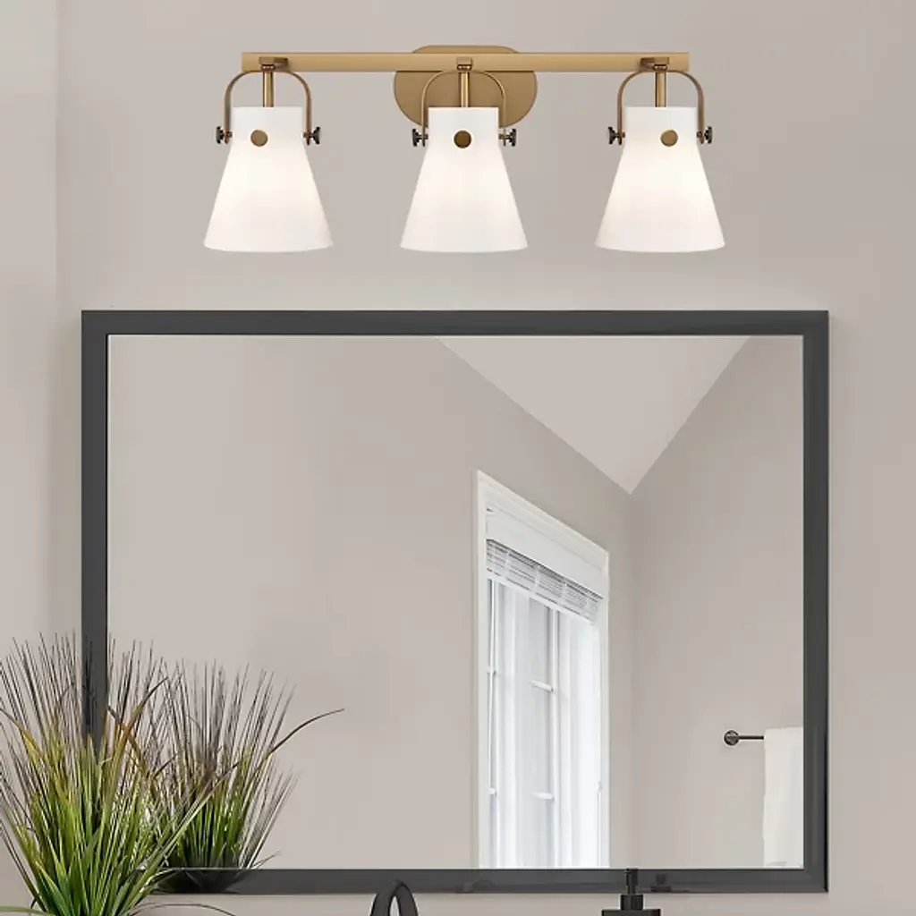 Modern bathroom lighting with a healthy dose of classic industrial flair. The Paisley Cone Vanity Light by Alder & Ore has a clean metal frame that includes an oval wall plate, rectangular bar and yoke-like shade holders that both support the cone-shaped glass shades and add mechanical, decorative detail. That eye-catching detail is further enhanced by the metal pins that keep the shades securely in place over a bathroom mirror or other vanity area.