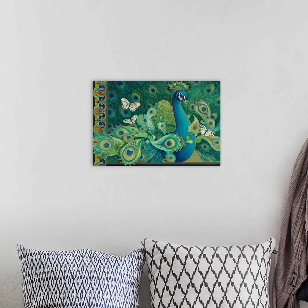 Contemporary artwork of a peacock with exaggerated and elaborate feathers, with butterflies hovering.