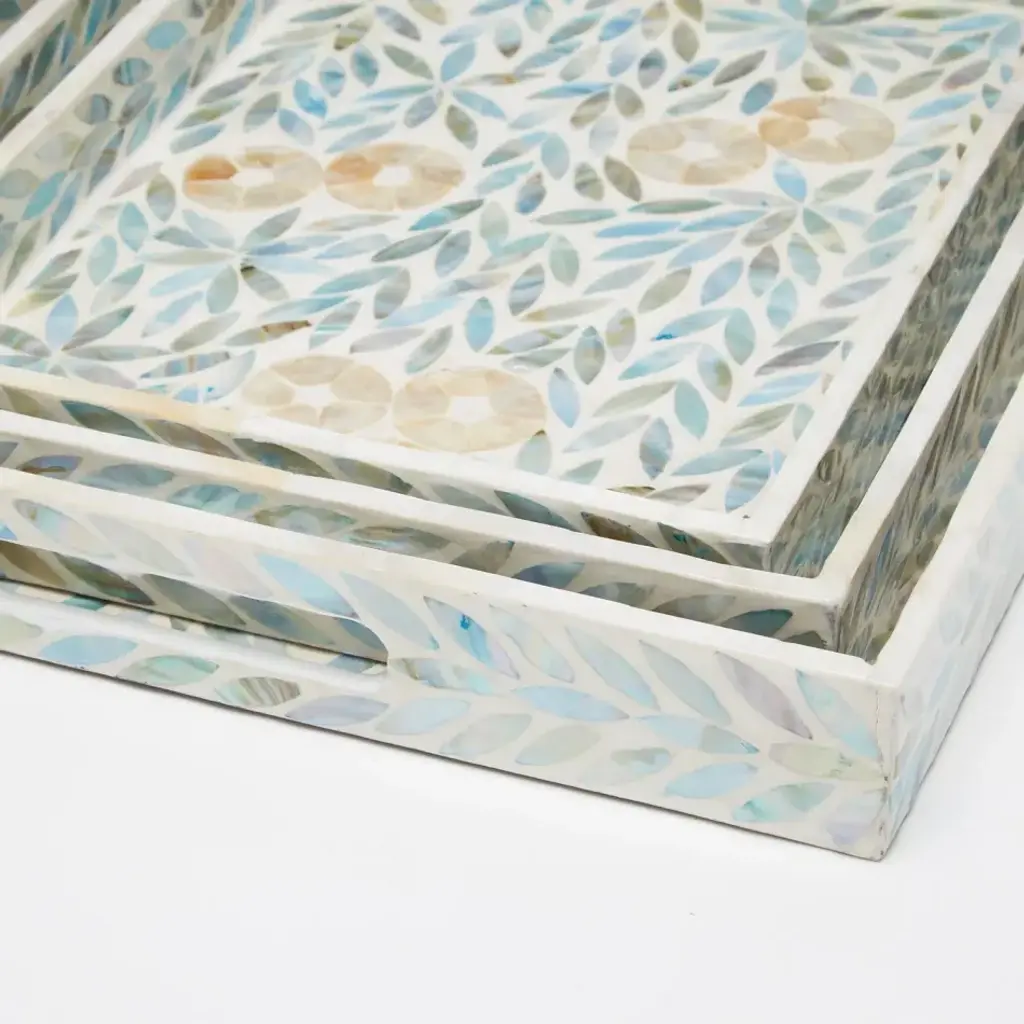 Reminiscent of a watercolor painting, this stunning set of trays proves that art doesn't have to hang on the wall. Crafted from mother of pearl, the designs feature elegant illustrations of Palawan flowers.