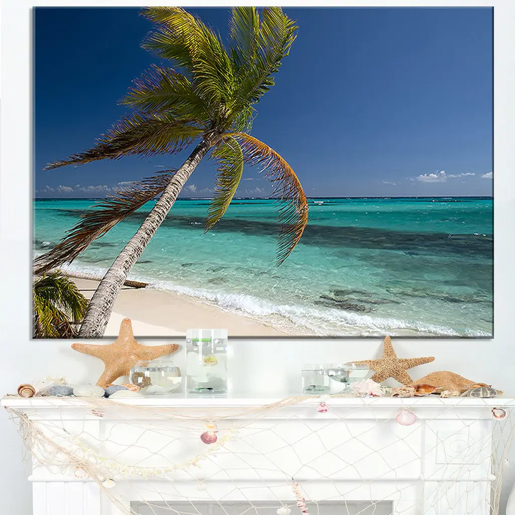 The Palm Bent to Picturesque Seashore canvas art print is sure to make an impression on anyone who sees it. This artwork is gallery wrapped around a 1-inch solid wood frame and arrives carefully packaged and entirely ready to hang on the wall. Design Art only uses the highest resolution and pigments to ensure a crisp colorful print that is never faded or pixelated. This artwork is sure to be a conversation starter in any home or office.