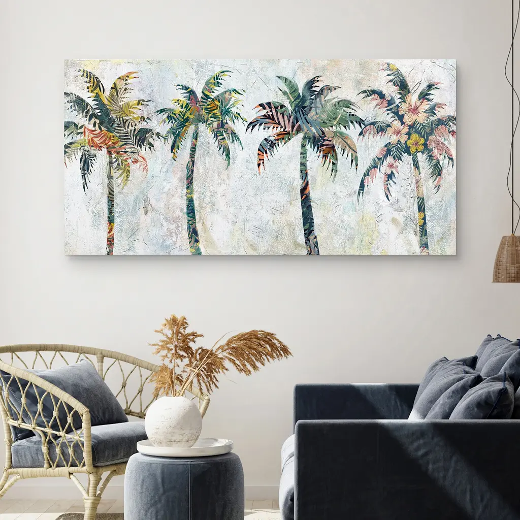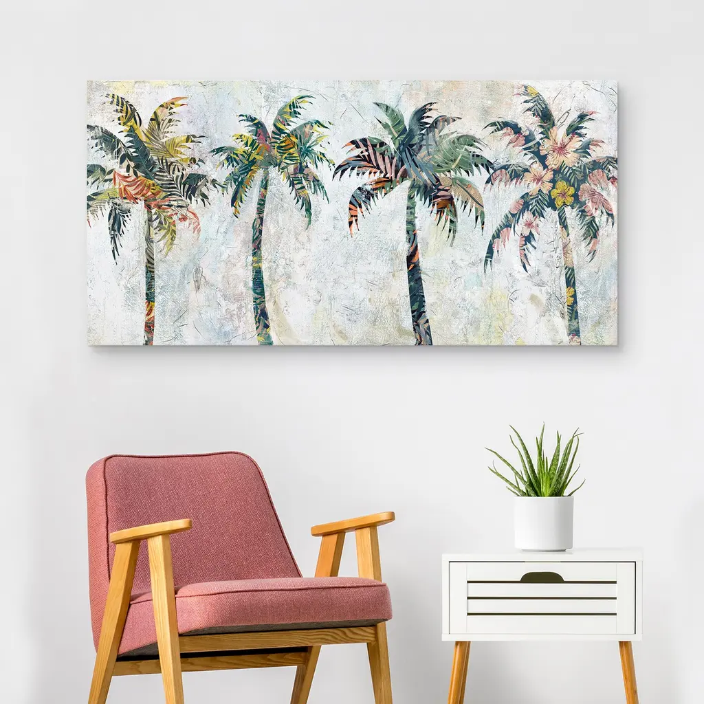 Four cheerful little palm trees sway gently in the breeze in this unique canvas print. Each tree stands silhouetted, filled with a stunning array of tropical botanical patterns, against a subtly textured white background. This premium giclee print is made with high-quality canvas material using cutting edge print technology. Offering full-bleed printing, which covers the entirety of the canvas, your new artwork will have that museum-quality look without the high price tag. Plus, your new masterpiece comes ready to hang: all you need are a few nails, a steady hand, and an eye for detail.