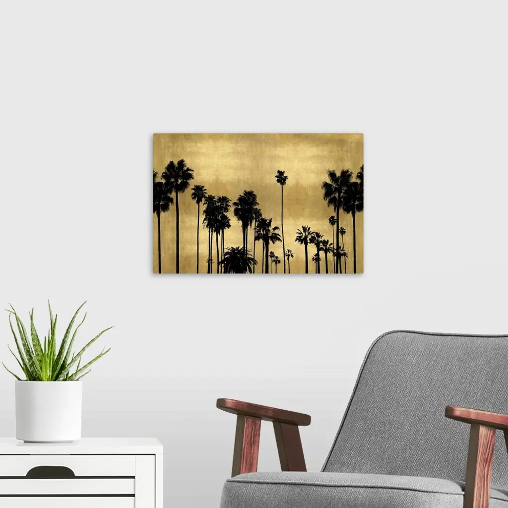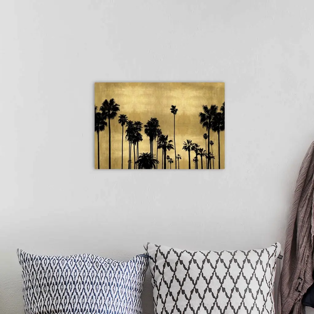 Decorative artwork featuring a black silhouette of palm trees over a distressed background.