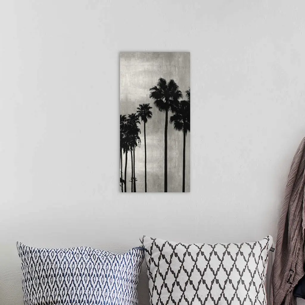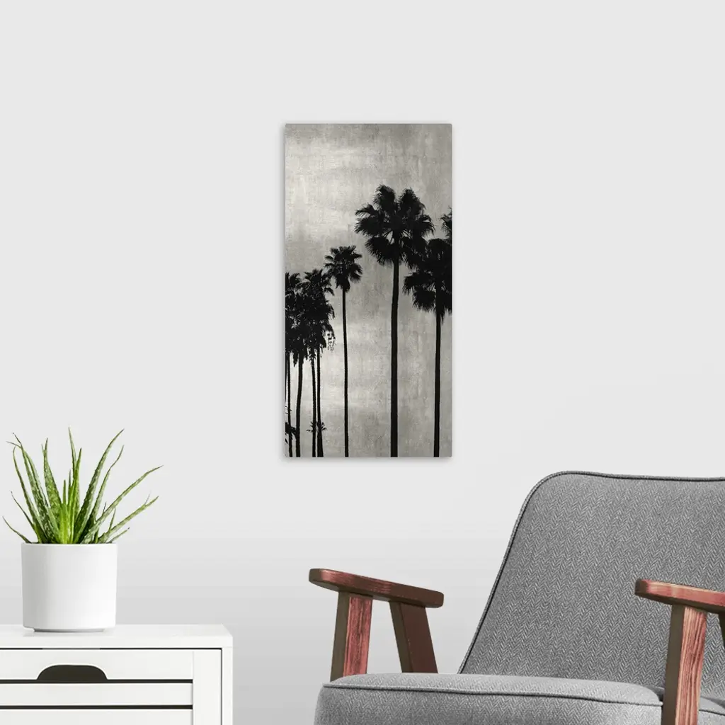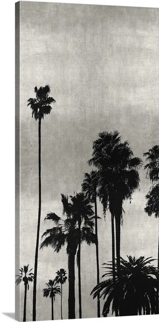 Decorative artwork featuring a black silhouette of a palm tree over a distressed background.