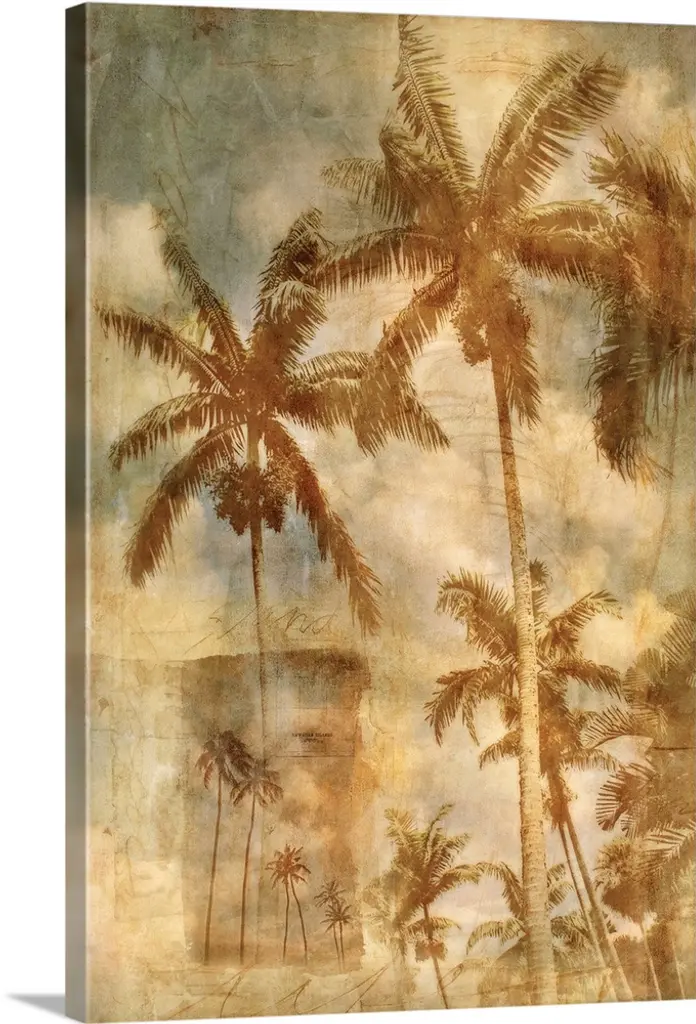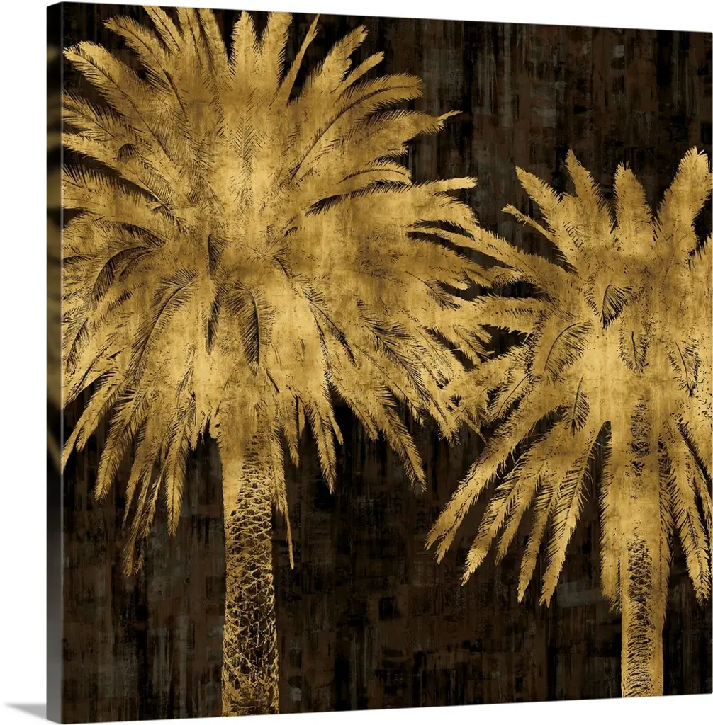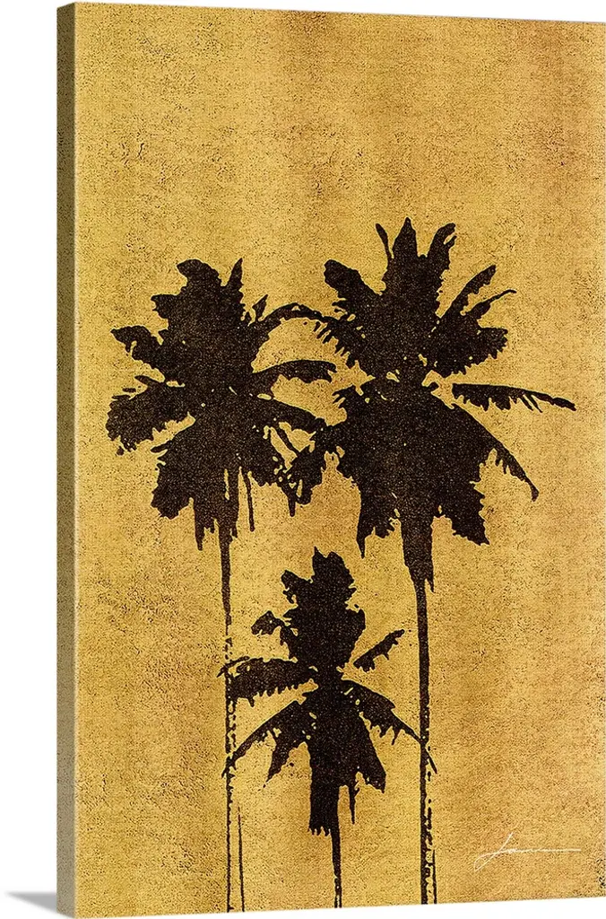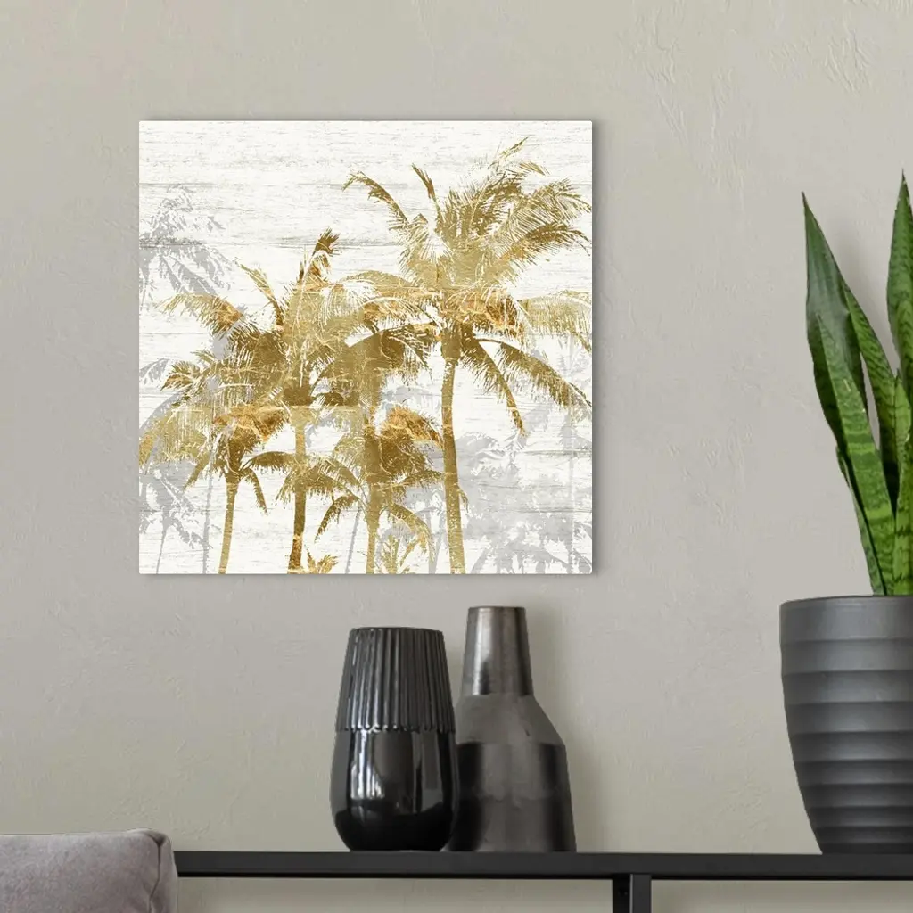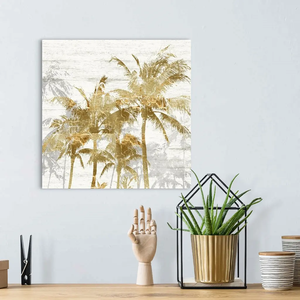 Square artwork of a group of gold palm trees with gray trees behind, on a white wood backdrop.