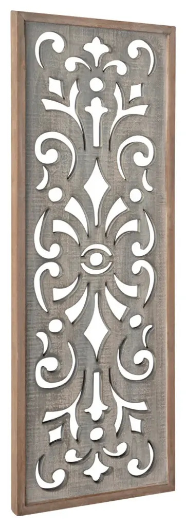 Introduce a rustic farmhouse aesthetic into your home with this lovely wood panel plaque from Kate and Laurel. The Palmares wall plaque takes inspiration from shabby-chic, farmhouse charm in its vintage design. It has a solid fir wood construction, with a hand-distressed, two-tone rustic brown and gray finish. The crown jewel of this lovely wall decor is its interior latticework carved with ornate, abstract pattern work. The overall dimensions of this robust statement piece are 12 inches wide by 31.5 inches high by 1.25 inches deep. It adds an antique look to any living room, bedroom, dining room, kitchen, entryway, or kitchen. In multiples, they make an excellent wall display, flanking the sides of a robust, rustic mirror or a piece of wall art. This plaque looks attractive on its own as a focal point or displayed side by side for a rustic, vintage wall display. The Palmares wall plaque features metal triangle hangers securely attached to the back of the fir wood frame for quick installation in just a matter of seconds. This piece of wall decor will create a lovely rustic vibe in any space of your home. • RUSTIC CARVED DESIGN: This wall panel plaque features an ornate, carved design for a vintage farmhouse look and wall statement• QUALITY MATERIALS: This premium rustic accent has a 100% wood construction with a hand-distressed finish for an authentic farmhouse look• LARGE SIZE: The overall dimensions of this wall accent are 31.5 inches high by 12 inches wide by 1.25 inches deep, giving you an eye-catching focal point for your home• DECORATIVE STATEMENT: Use this beautiful accent piece to showcase your farmhouse style in any rustic living room, bedroom, bathroom, entryway, or dining room• EASY TO HANG: Hang the Palmares in a matter of seconds with easy-to-use metal triangle hangers attached to the back