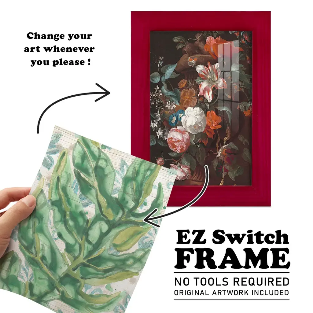 Palms & Patterns II -EZ SWITCH Framed Print w/glass-Cherry Red A delightful, framed print. Featuring a solid wood frame with real wood glass. This premium print is giclee quality. In addition, every frame features a removable back and table top stand. This allows you to change your art in the future or to just stand the art on a table for a new look. We are sure you'll enjoy our new series of EZ SWITCH Framed Art. Solid Wood Frame Real Glass Removable / Replaceable Art Built in Tabletop Stand Sizes range from 4x6 up to 12x15 - buy just one or pair them up as sets as you see fit.