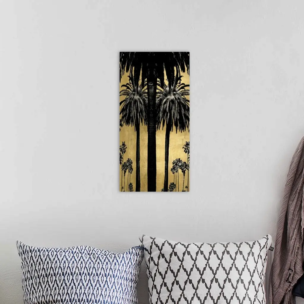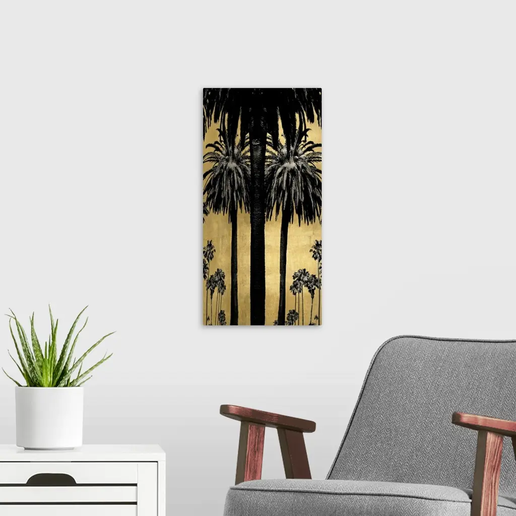Decorative artwork featuring a black silhouette of palm trees over a distressed background.