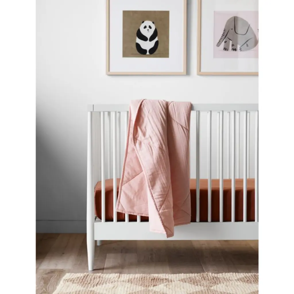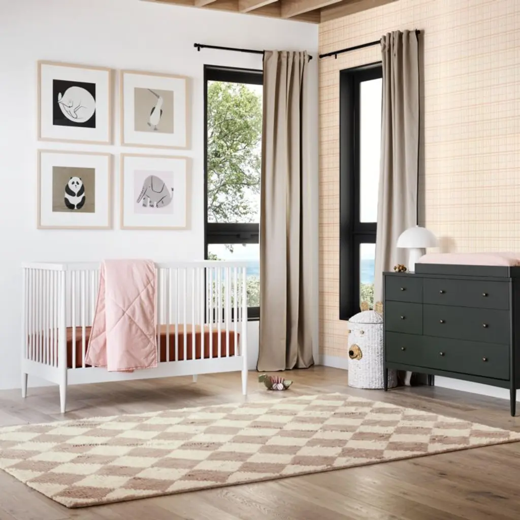This adorably rotund panda brings high contrast and minimalist style to a nursery or playroom. An original digital illustration by Chicago-based artist Betsy Siber, the custom giclee-print is rendered in confident strokes and a gender-neutral palette of black, white and sand. Framed in natural wood with a white mat, it looks great on its own above a dresser or bookcase, but it's especially charming when placed among Siber's other animal artworks to create a friendly menagerieas featured in Mandy Moore's nursery.