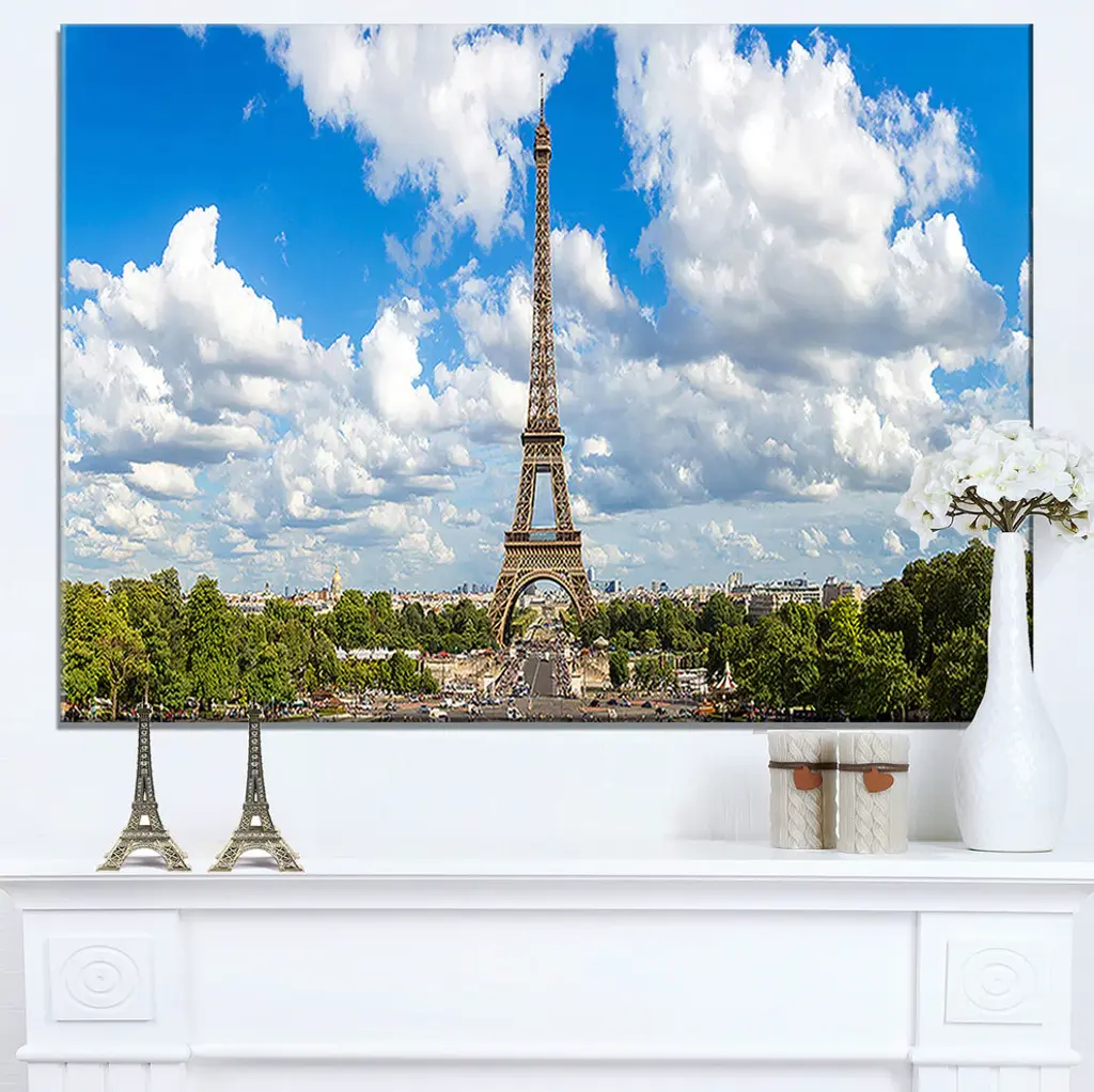 The Panoramic Paris Eiffel Tower under Clouds canvas art print is sure to make an impression on anyone who sees it. This artwork is gallery wrapped around a 1-inch solid wood frame and arrives carefully packaged and entirely ready to hang on the wall. Design Art only uses the highest resolution and pigments to ensure a crisp colorful print that is never faded or pixelated. This artwork is sure to be a conversation starter in any home or office.