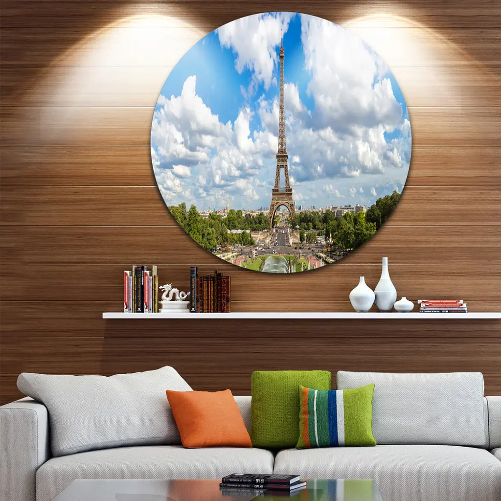 Bring Contemporary Abstraction to your home with this large Circle Metal wall art. This Panoramic Paris Eiffel Tower under Clouds Metal Artwork makes it the focal point of any room or office. - White Gloss Coating ensures colors are extra vibrant with light reflection.- Aluminum grade Sheet Metal with 1 inch mounting frame on the back giving the illusion that the artwork is floating on the wall..- Mounting Brackets are included along with instructions.- High Quality Digital images are created directly into a glossy aluminum panel producing a stunning and captivating print into the glossy finish of the metal.- Water, Fire and Scratch resistant HD Aluminum panels.- Looks better than any photo paper and guaranteed to last at least 20 years- Easy to clean with a microfiber cloth. Colors are far superior to regular Canvas Art. - Easy to Hang