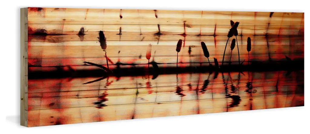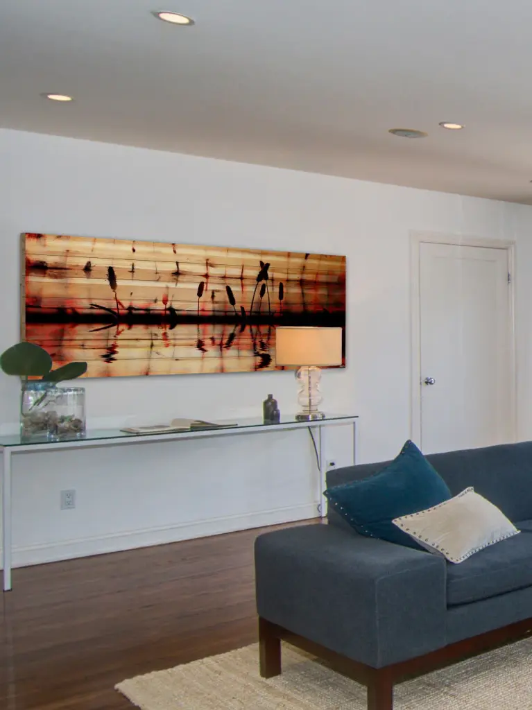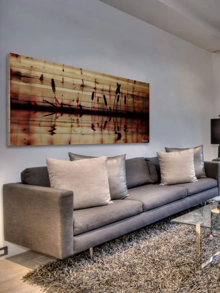 "Panoramic Reflection" Painting Print On Natural Pine Wood, 60"x20"