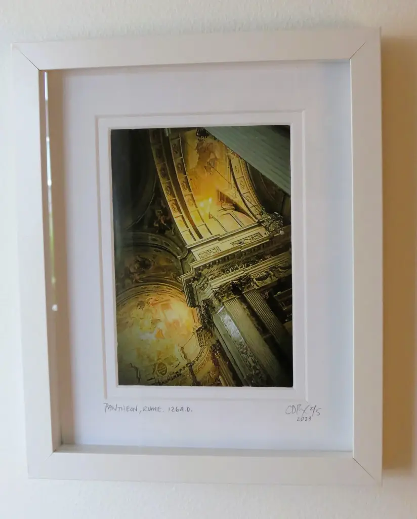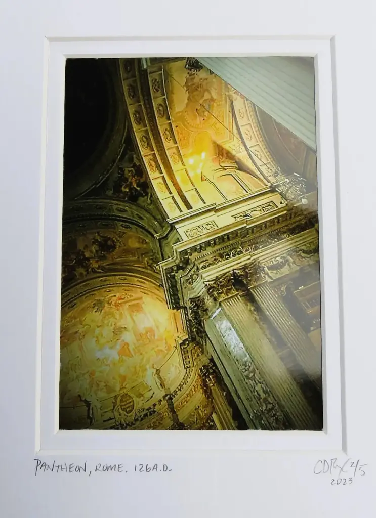 The Famed Ancient Pantheon, Rome 126 A.D. Ethereal Vintage style color digital filter and unique angled perspective adds a unique visual impact to this Limited Edition Travel and Architectural photography. framed and double matted under glass. 9" x 11". Size matted at 4.5" x 6.5". Signed dated. White modern frame with backing and hanging hardware attached
