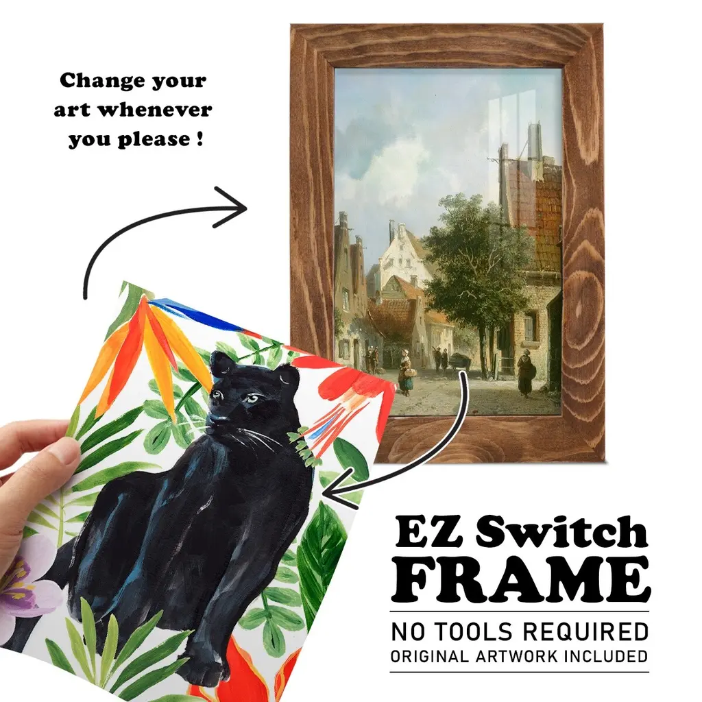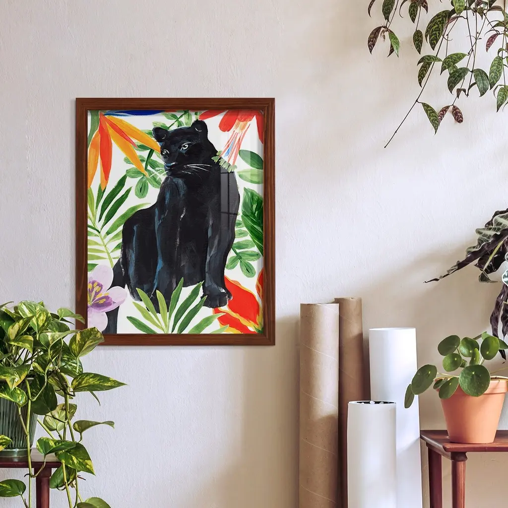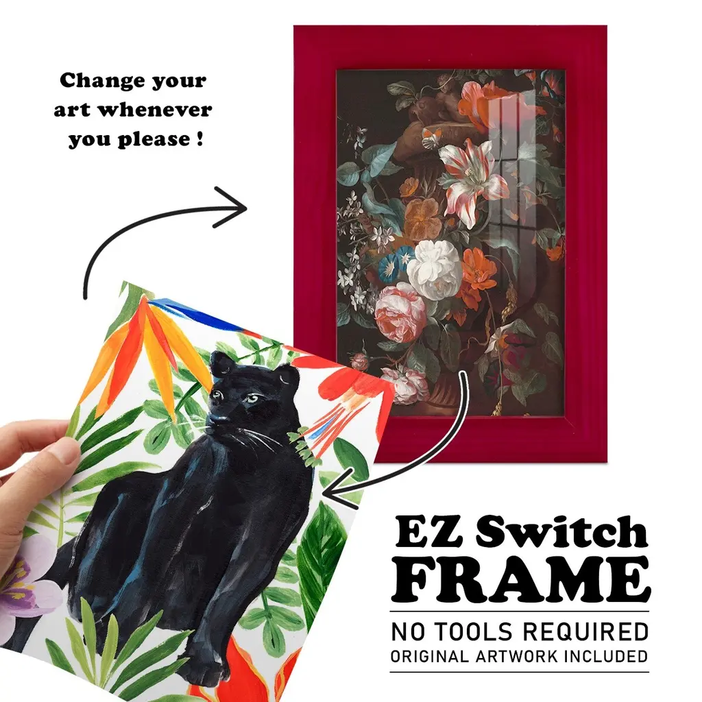 Panther's Paradise I -EZ SWITCH Framed Print w/glass-Cherry Red A delightful, framed print. Featuring a solid wood frame with real wood glass. This premium print is giclee quality. In addition, every frame features a removable back and table top stand. This allows you to change your art in the future or to just stand the art on a table for a new look. We are sure you'll enjoy our new series of EZ SWITCH Framed Art. Solid Wood Frame Real Glass Removable / Replaceable Art Built in Tabletop Stand Sizes range from 4x6 up to 12x15 - buy just one or pair them up as sets as you see fit.
