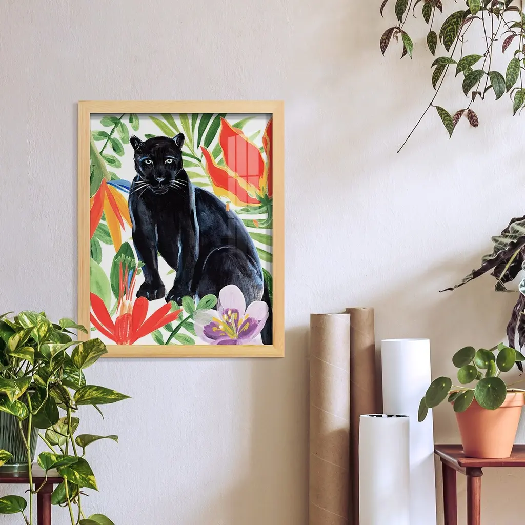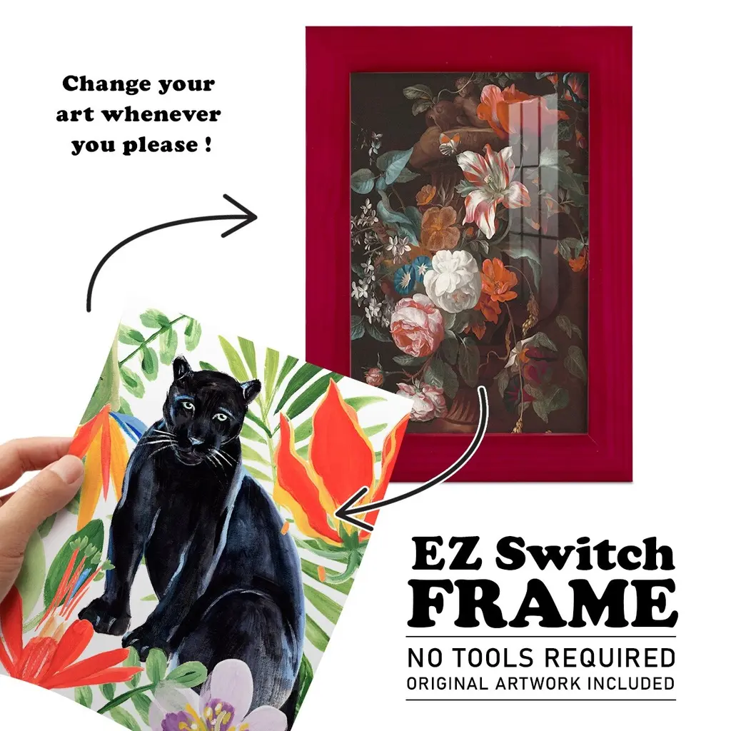 Panther's Paradise II -EZ SWITCH Framed Print w/glass-Cherry Red A delightful, framed print. Featuring a solid wood frame with real wood glass. This premium print is giclee quality. In addition, every frame features a removable back and table top stand. This allows you to change your art in the future or to just stand the art on a table for a new look. We are sure you'll enjoy our new series of EZ SWITCH Framed Art. Solid Wood Frame Real Glass Removable / Replaceable Art Built in Tabletop Stand Sizes range from 4x6 up to 12x15 - buy just one or pair them up as sets as you see fit.