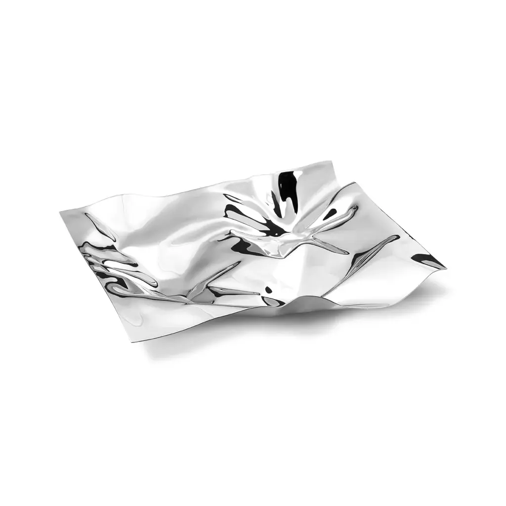 Sometimes affectionately nicknamed ‘Car Crash’, this iconic decorative serving tray was designed by legendary Verner Panton by crumpling up a piece of paper and asking the silversmith to recreate the smoothed out shape in sterling silver. Now available in stainless steel, the dish makes a dramatic centerpiece to a table even when empty. Truly a superstar in the world of mid-century design, Danish-born Verner Panton’s iconoclastic and uncompromising vision was applied to everything from architecture and furniture to lighting and artwork. His work is still held in high regard and continues to influence a whole new generation of creatives. Features