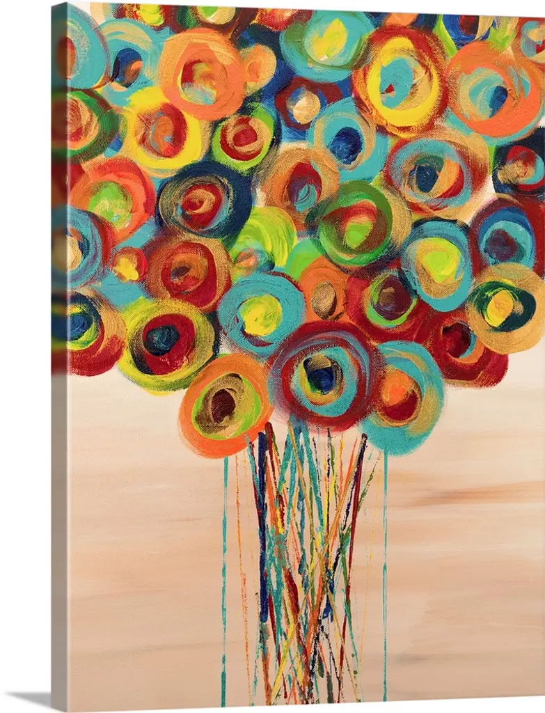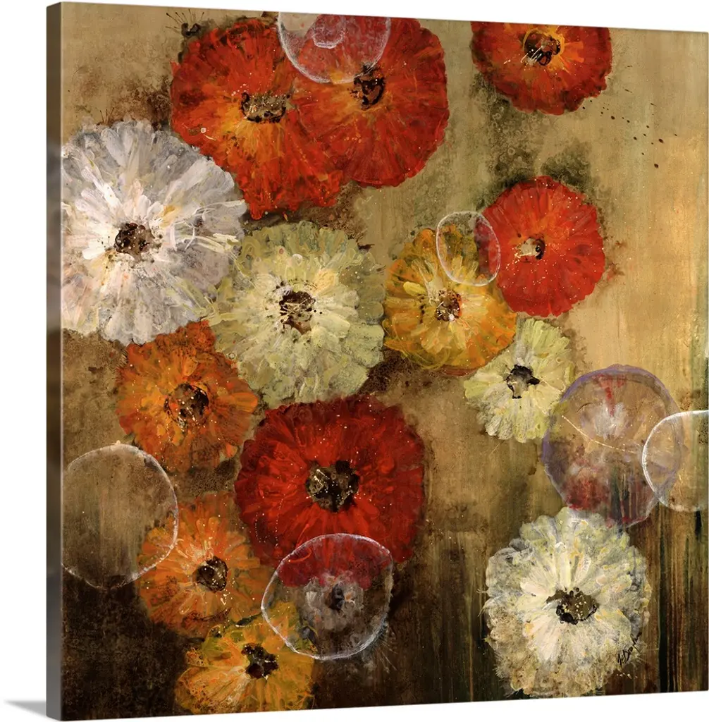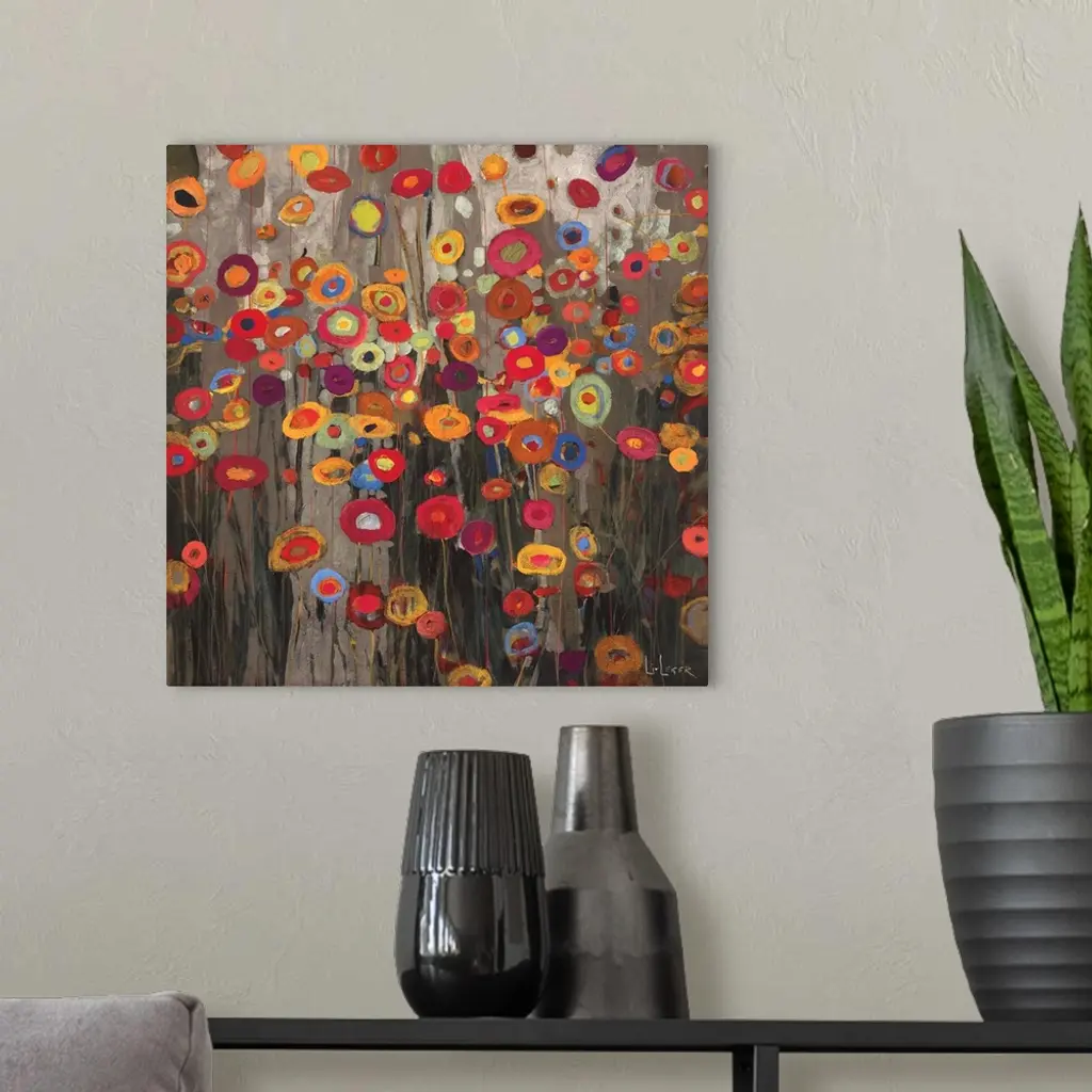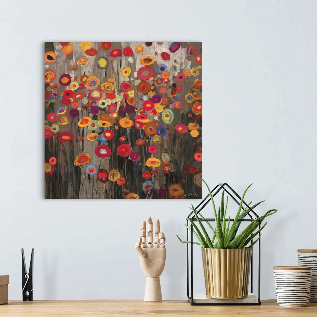A square painting of a group of multi-colored poppies on a neutral backdrop.