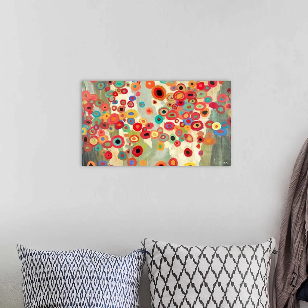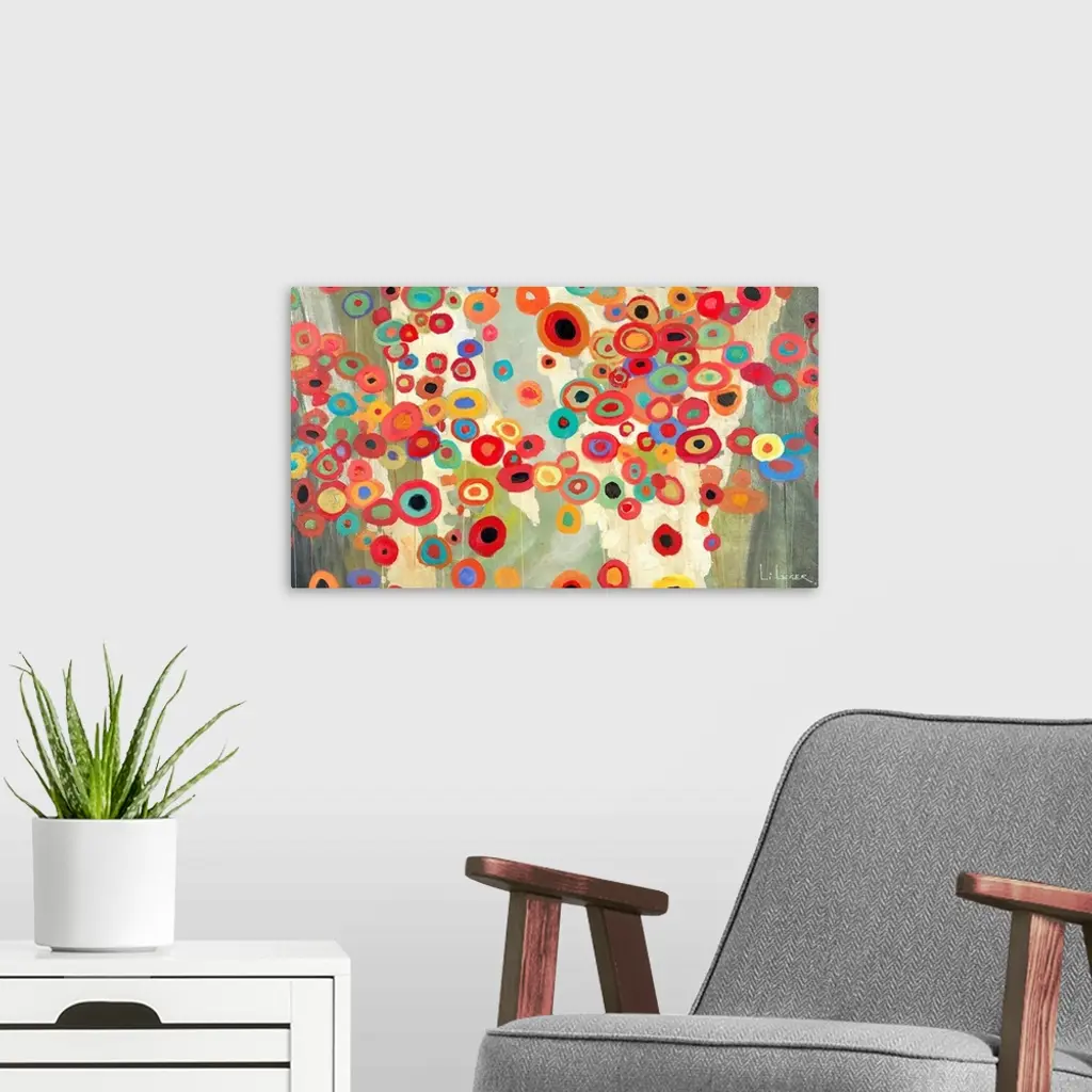 Horizontal painting of a group of multi-colored circles against a neutral backdrop.