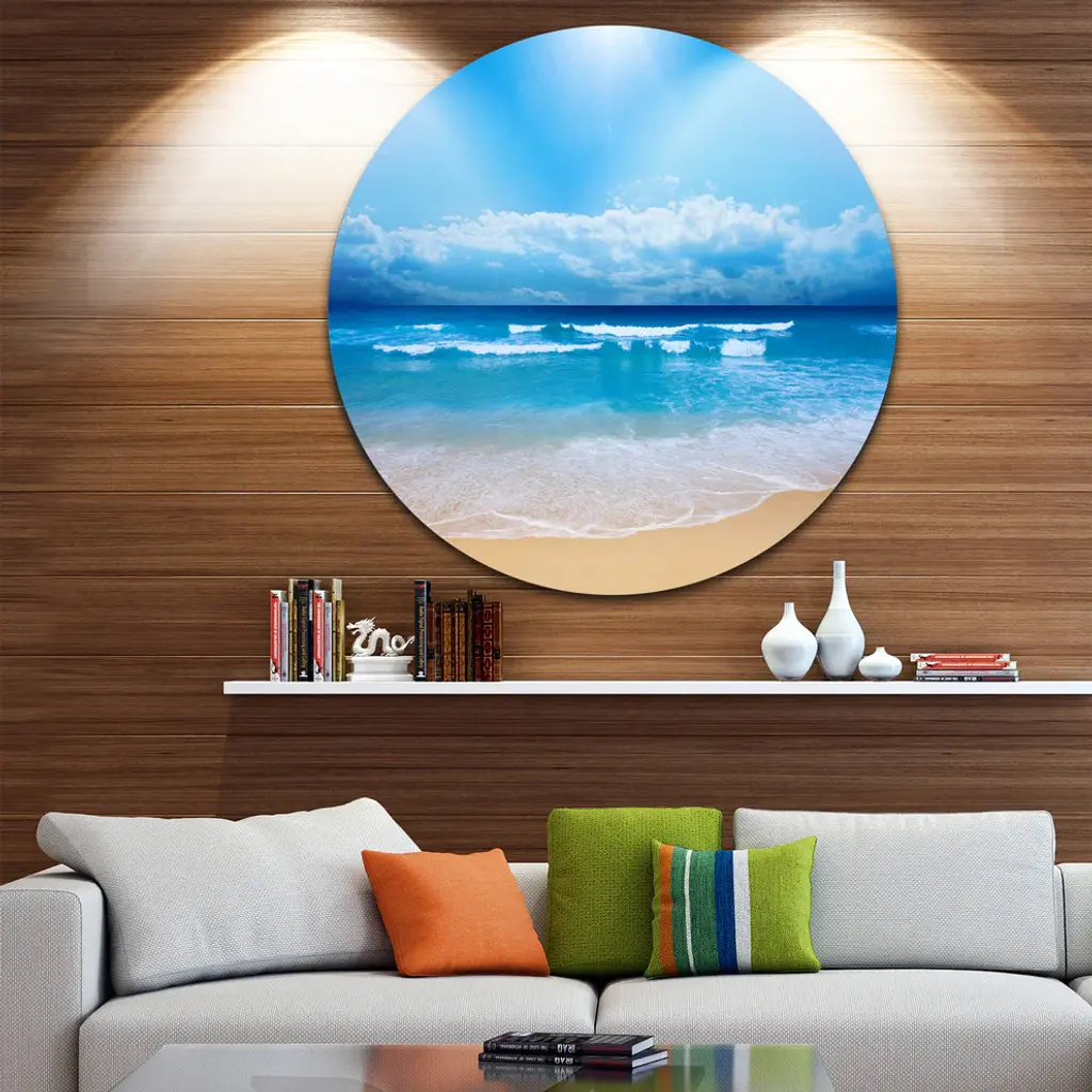 Bring Contemporary Abstraction to your home with this large Circle Metal wall art. This Paradise Beach Metal Artwork makes it the focal point of any room or office. - White Gloss Coating ensures colors are extra vibrant with light reflection.- Aluminum grade Sheet Metal with 1 inch mounting frame on the back giving the illusion that the artwork is floating on the wall..- Mounting Brackets are included along with instructions.- High Quality Digital images are created directly into a glossy aluminum panel producing a stunning and captivating print into the glossy finish of the metal.- Water, Fire and Scratch resistant HD Aluminum panels.- Looks better than any photo paper and guaranteed to last at least 20 years- Easy to clean with a microfiber cloth. Colors are far superior to regular Canvas Art. - Easy to Hang